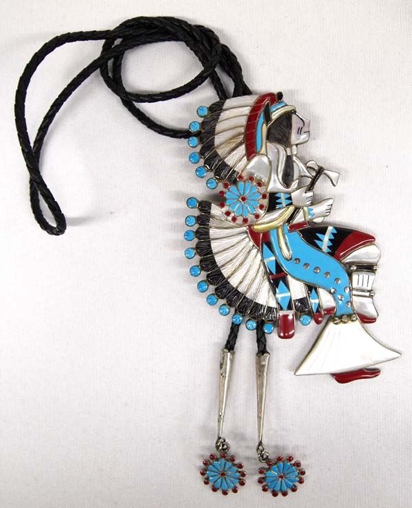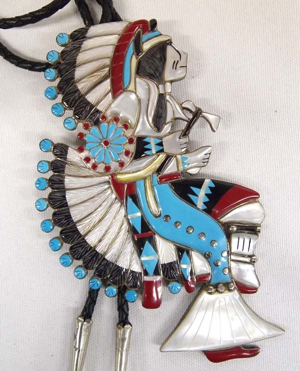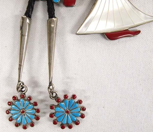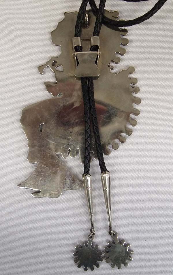 Large Native American Zuni German Silver Inlay Bolo Tie, slide measures 3'' x 5'', 80.28g in total wt.