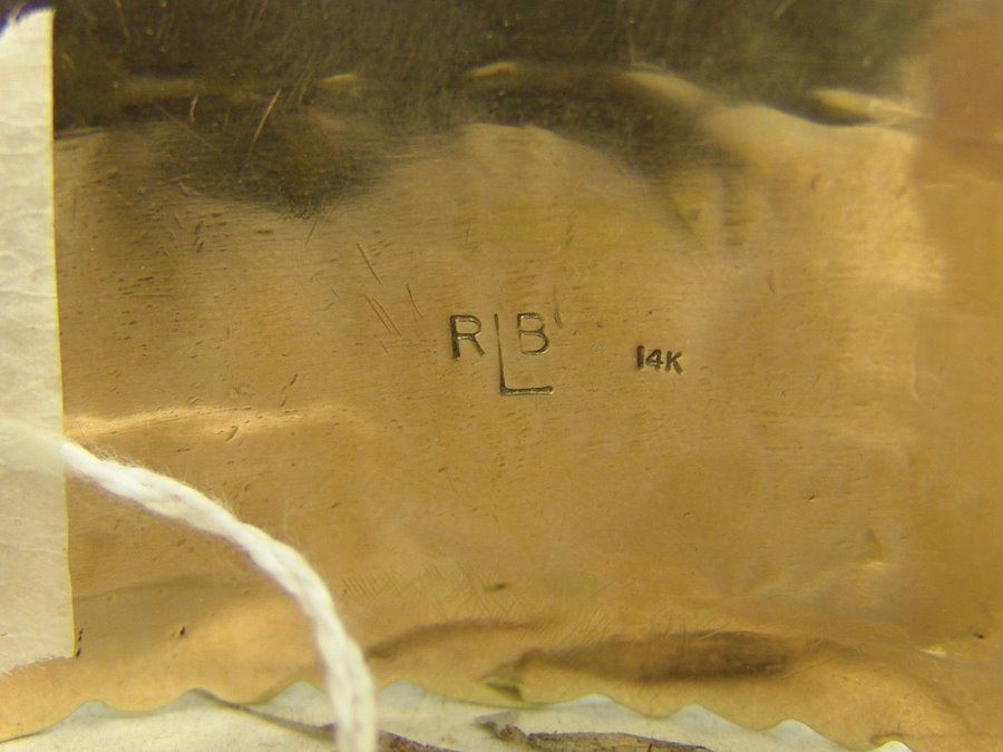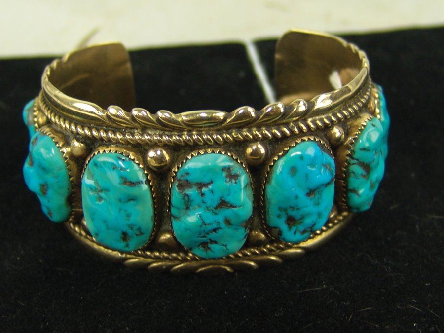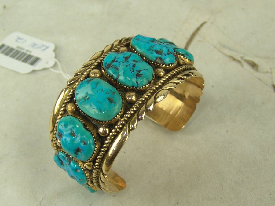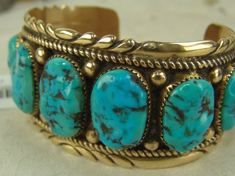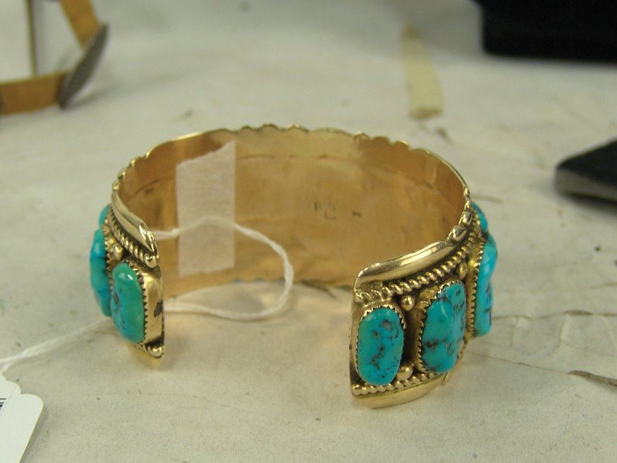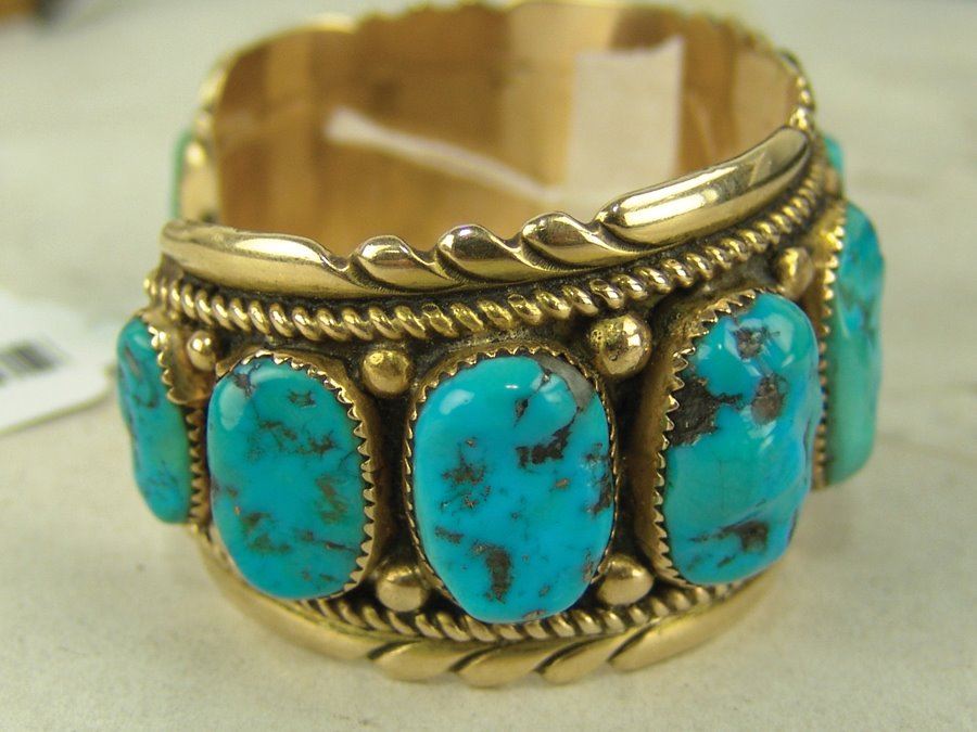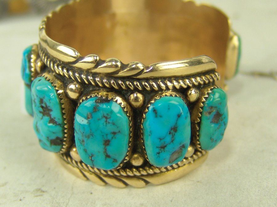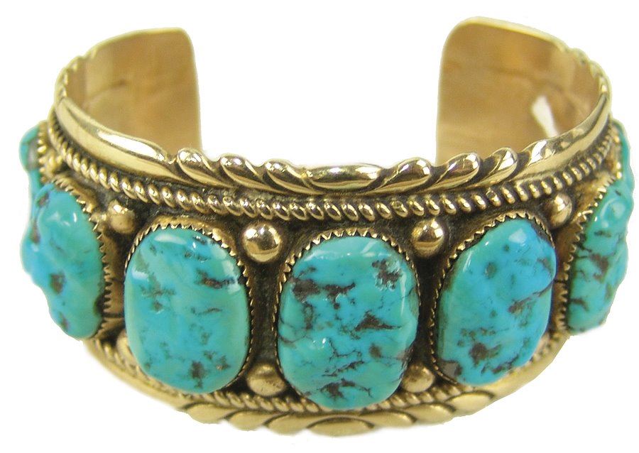 Outstanding solid 14kt gold cuff bracelet with their signature file work edges and roped details and with eleven lightly carved and polished Morenci turquoise stones. Very good condition. An impressive piece. Net,Ca. 1980s,5-5/8" + 1-1/4" x 1-1/2"