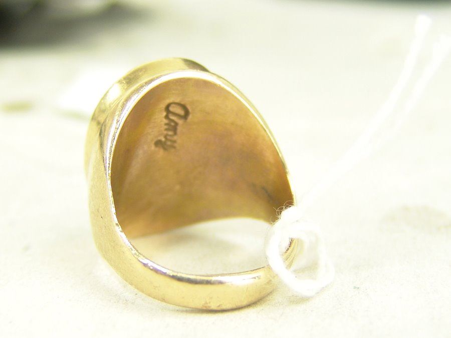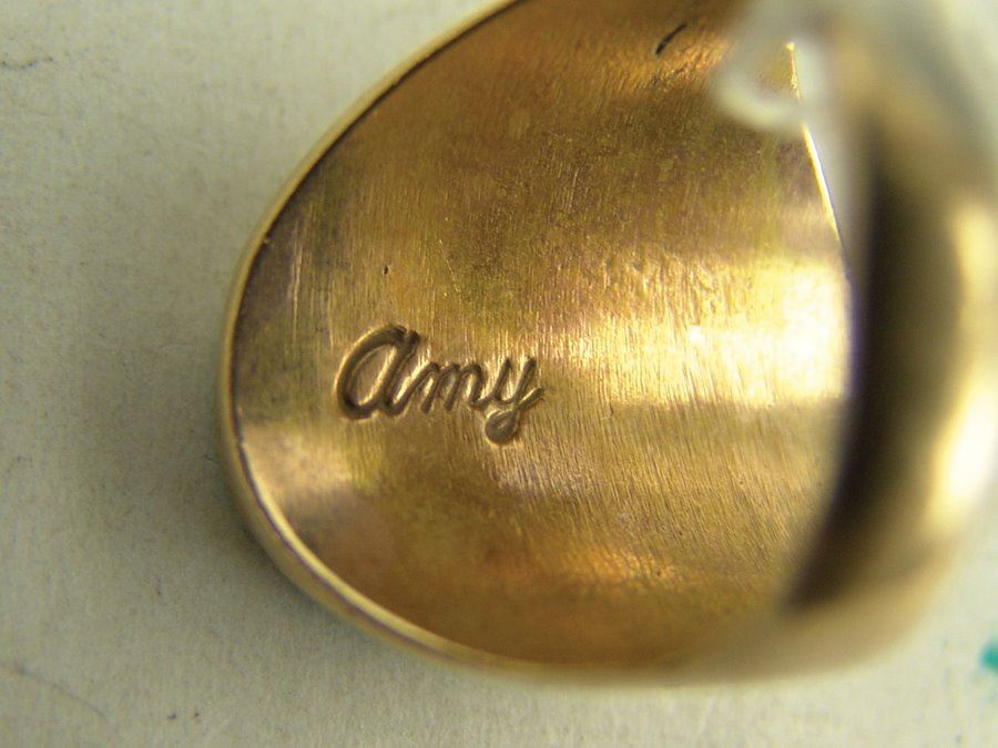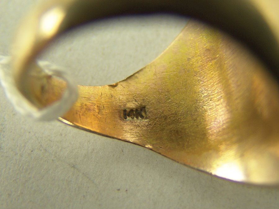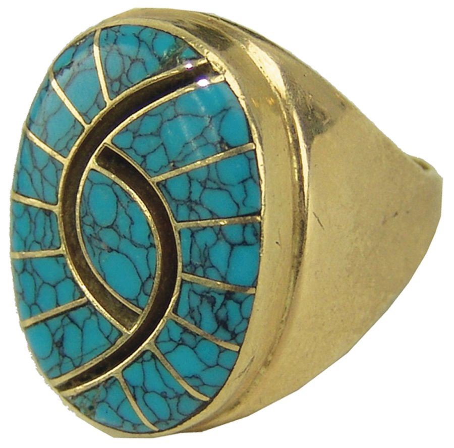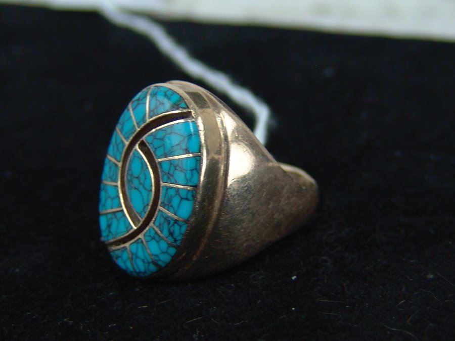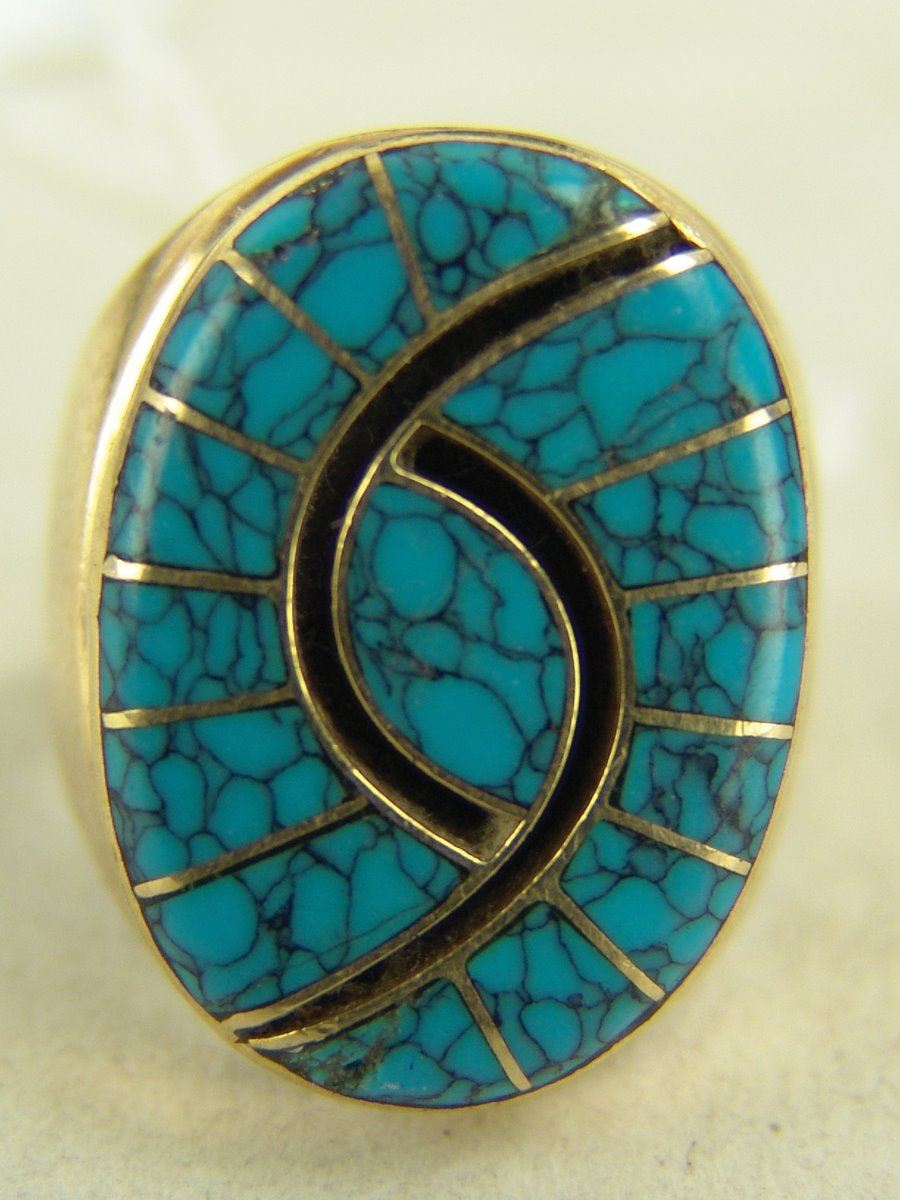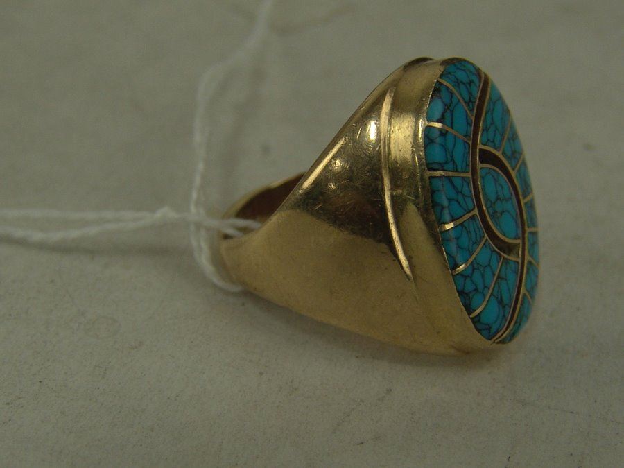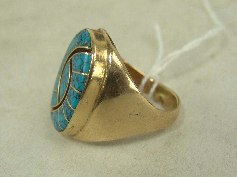 Fine solid 14kt gold ring with her signature yin-yang style design finely inlaid with turquoise. Very good condition, shows light use. Net weight 20g.,Late 1900s,Size 10