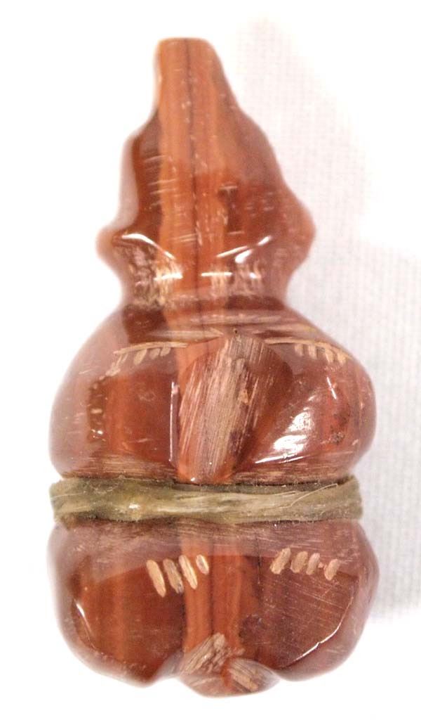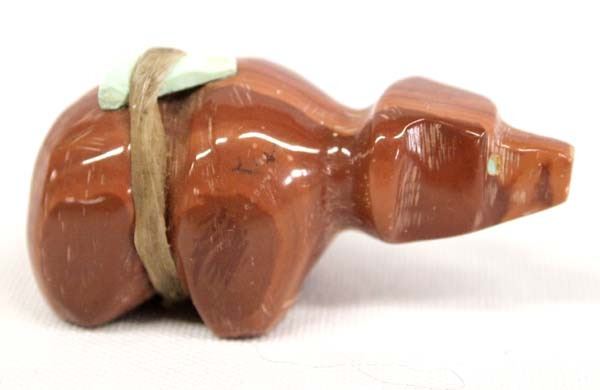 Native American Zuni Hand Jasper Carved Bear Fetish, carved turquoise arrowhead power pack, measures 2'' x 5/8'', small nip out of arrowhead