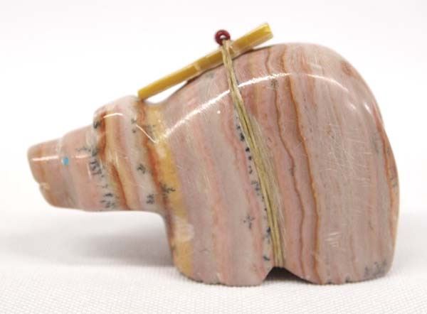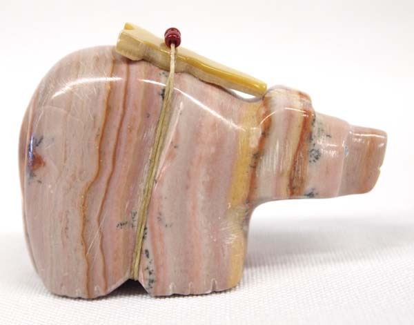 Native American Zuni Hand Carved Dolomite Bear Fetish, measures 2.25''L x 1.5''H x .75''W, carved gold lip shell arrowhead and red bead spirit pack, turquoise eyes
