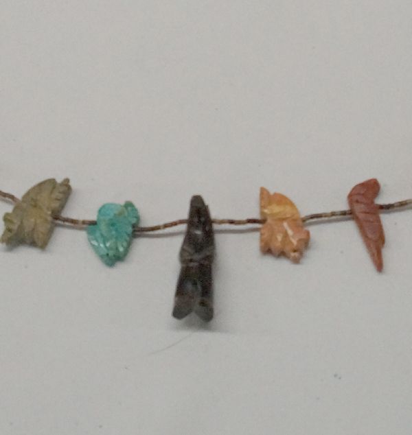 Zuni Hand Carved Fetish Necklace, measures 30.5''L end to end and largest fetish is center bear at 1.75''L x .5W, features wide array of fetishes carved in various stones, sterling cones and findings, pin shell heishi beads