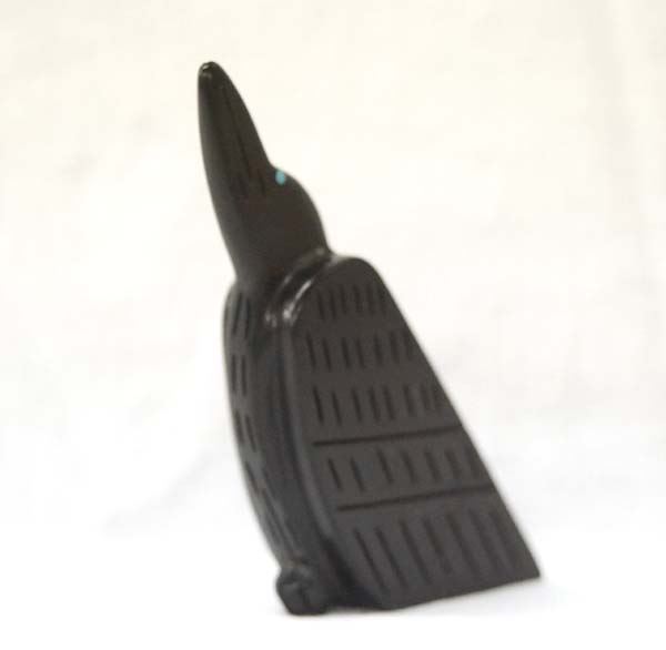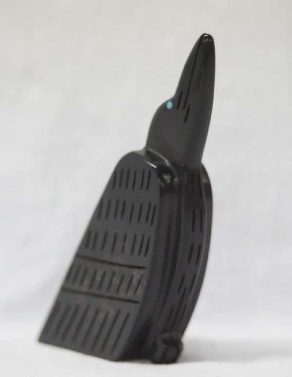 Native American Zuni Indian Hand Carved Raven Fetish from the Zuni Pueblo in Western New Mexico. This fetish is beautifully carved into a piece of black Jet. The Raven features Turquoise inlay eyes and hand etched wings. Handmade by Zuni carver Amos Pooacha. Signed on the bottom.