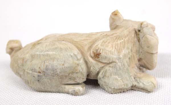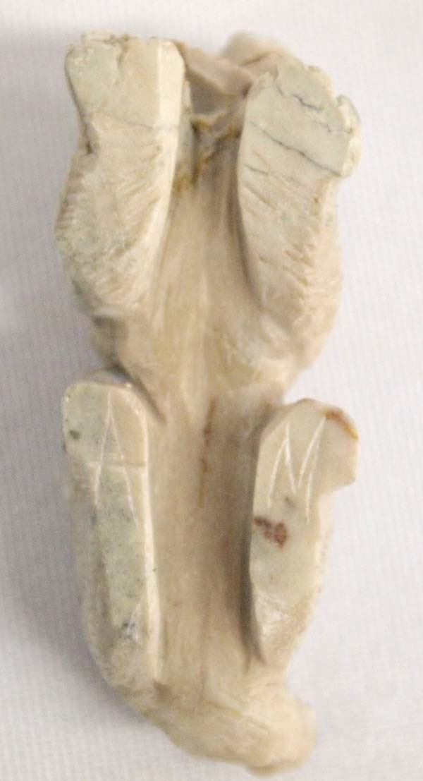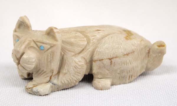 Native American Zuni Hand Carved Serpentine Bobcat Fetish by Ardale Mahooty, hallmarked AM, measures 2'' x .5'' and has turquoise eyes
