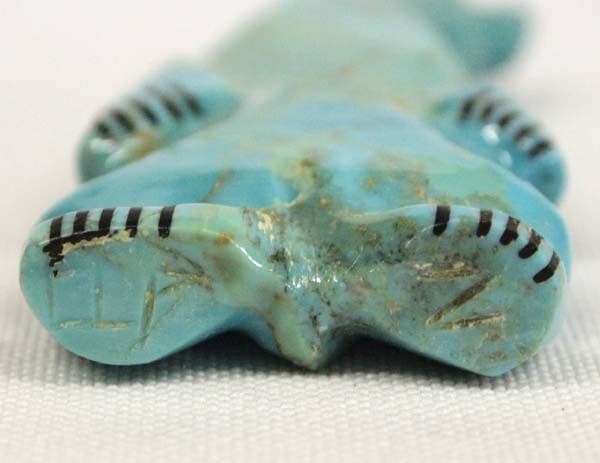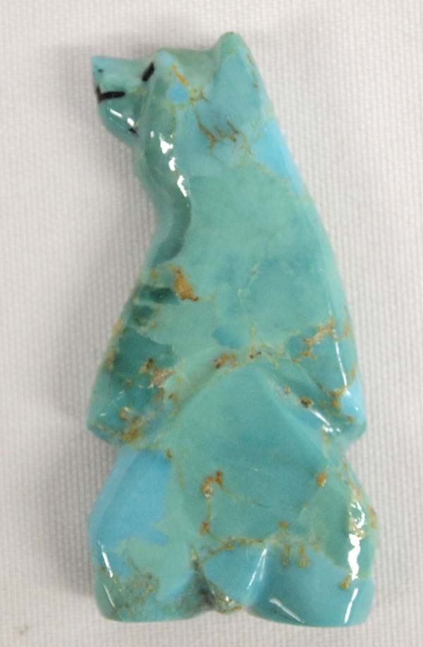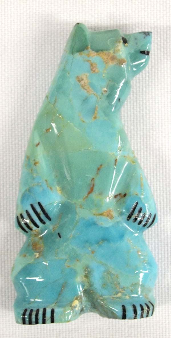 Native American Zuni Hand Carved Turquoise Bear Fetish by Claudia Peina, measures 2.5'' x 1.25'', jet eyes and claws, hallmarked by artist