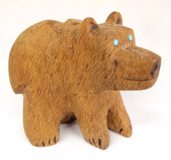 Native American Zuni Hand Carved Wood Bear Fetish by Alan Lewis, measures 4'' x 4.5'', signed by artist, turquoise eyes