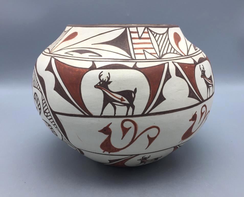Description: For sale in this lot is a beautifully decorated, handmade Zuni pot. This polychrome pot is a nice size for display. Maker: Signed, B. Paloma, Zuni. Approx. Age: 1986. Size: 9-3/8 inches wide x 7 inches tall. Condition: Good for its age, normal wear expected. Please look closely at the pictures - they are an important part of our description. Shipping: There will be a $10 handling / packaging fee for shipping this lot. The actual cost of postage will be added on top of that.