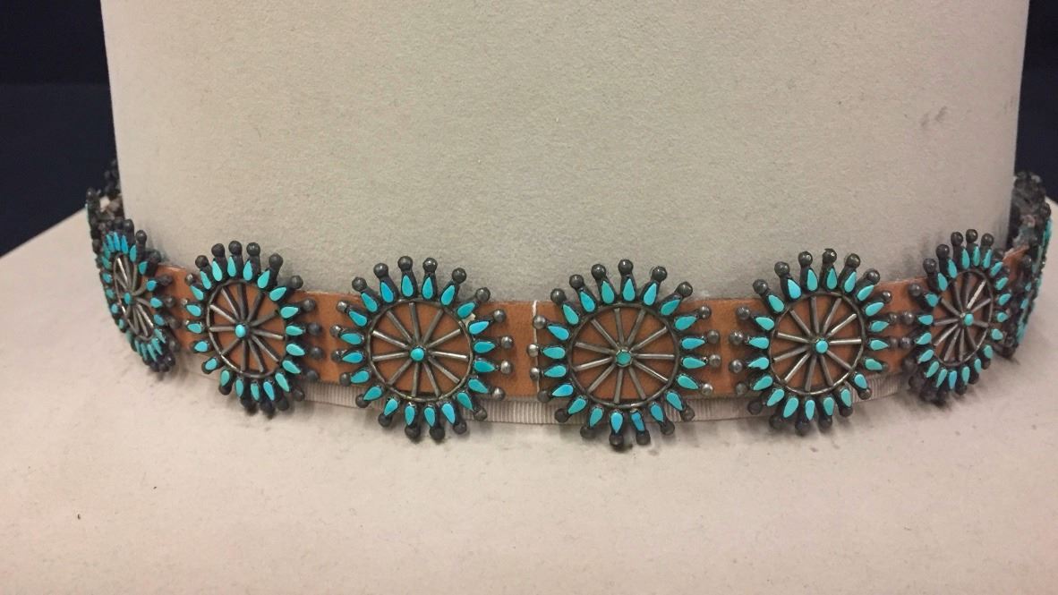 Maker: The hat is a Resistol and the hatband is an older Zuni piece. Approx. Age: Hatband is circa 1960s and the hat is from the 80s. Size: Hat is a size 7 1/8. Condition: Good. Additional Info: The man who purchased the hat new fashioned a hatband from an old Zuni concho belt that had belonged to his wife back in the 60s. Please look closely at the pictures - they are an important part of our description. Shipping: There will be a $7 handling / packaging fee for shipping this lot. The actual cost of postage will be added on top of that.