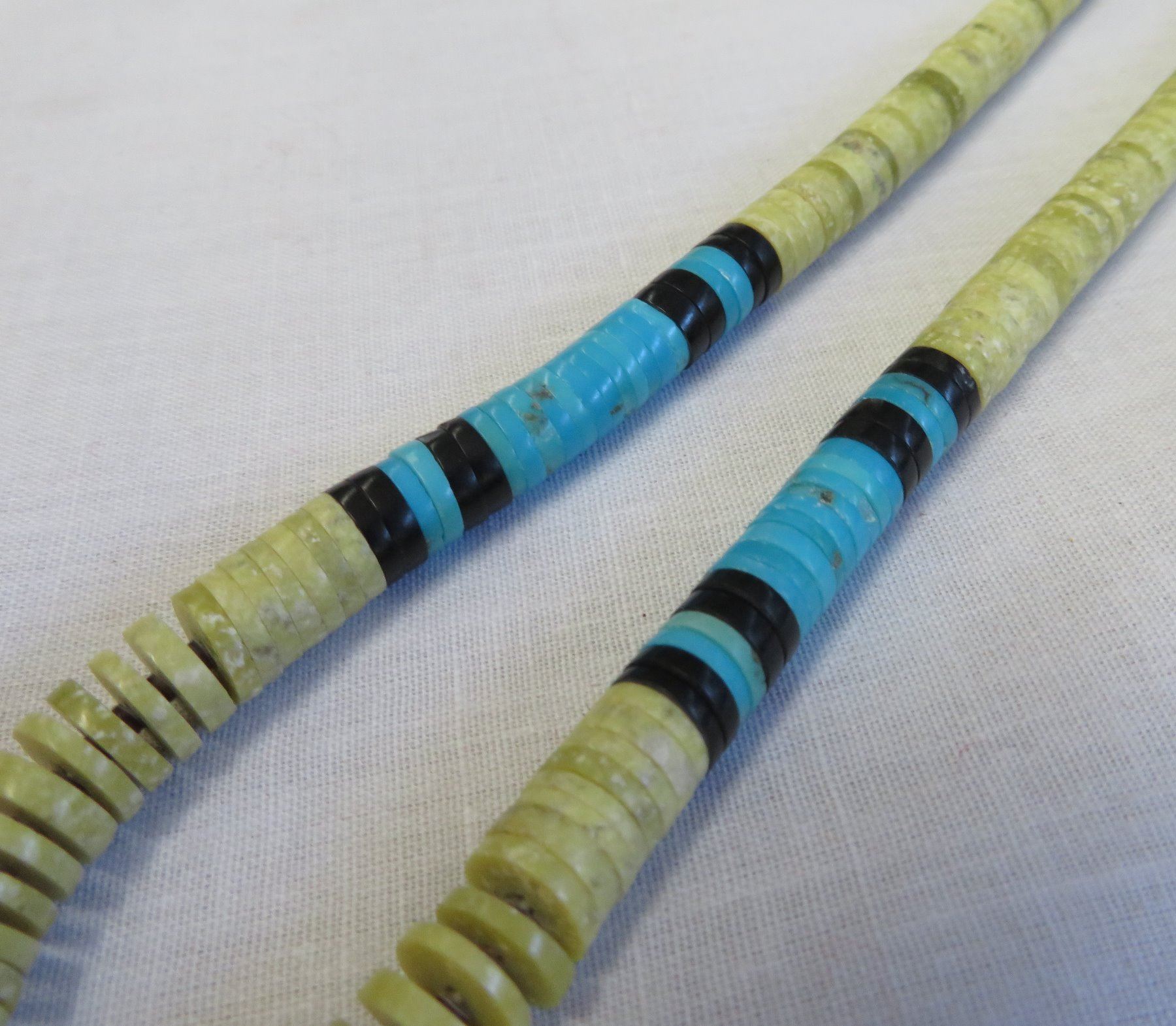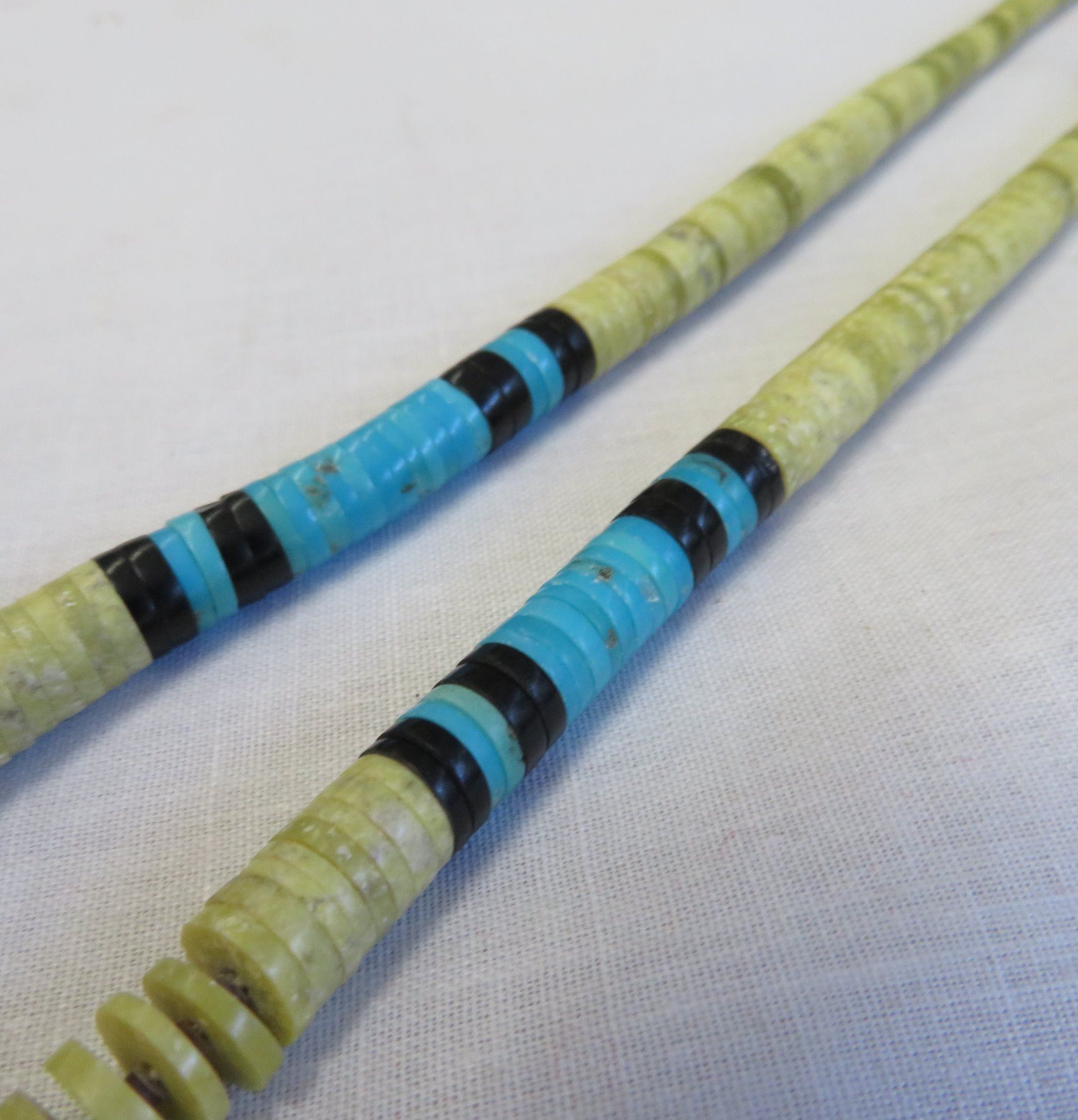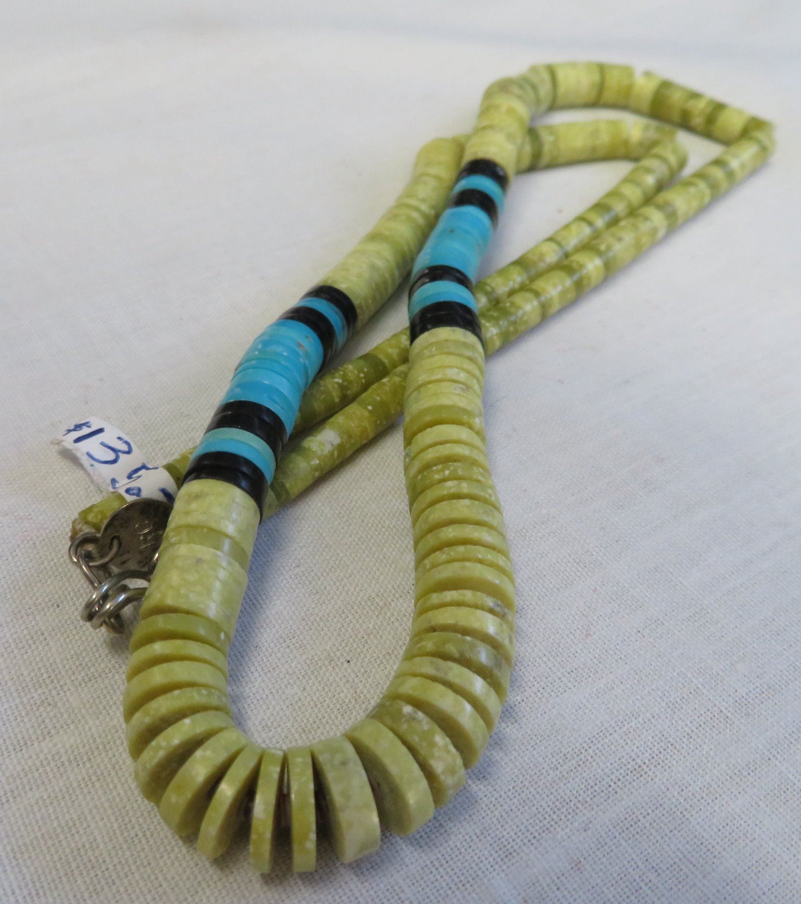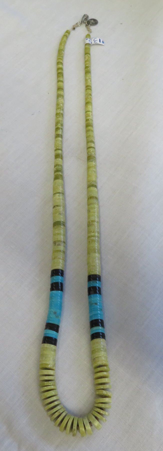 Zuni Heishi Necklace, c. 1960s. Made of stone, turquoise, jet and string, the item hangs about 11" as worn. Marked ARC-JRC. Pretty necklace with nice blue turquoise pieces which catch the eye. Condition: Good, some wear, see images. Shipping: $14.50 w/insurance and signature.