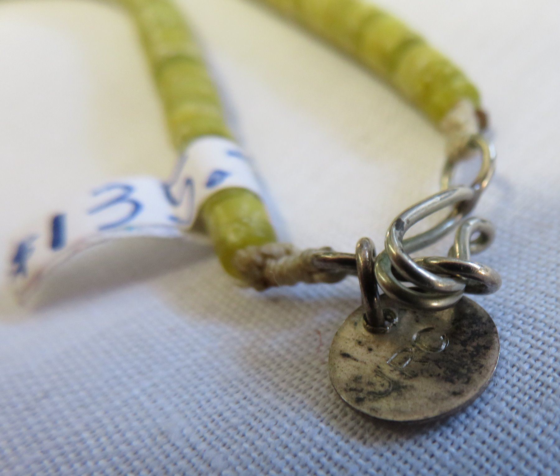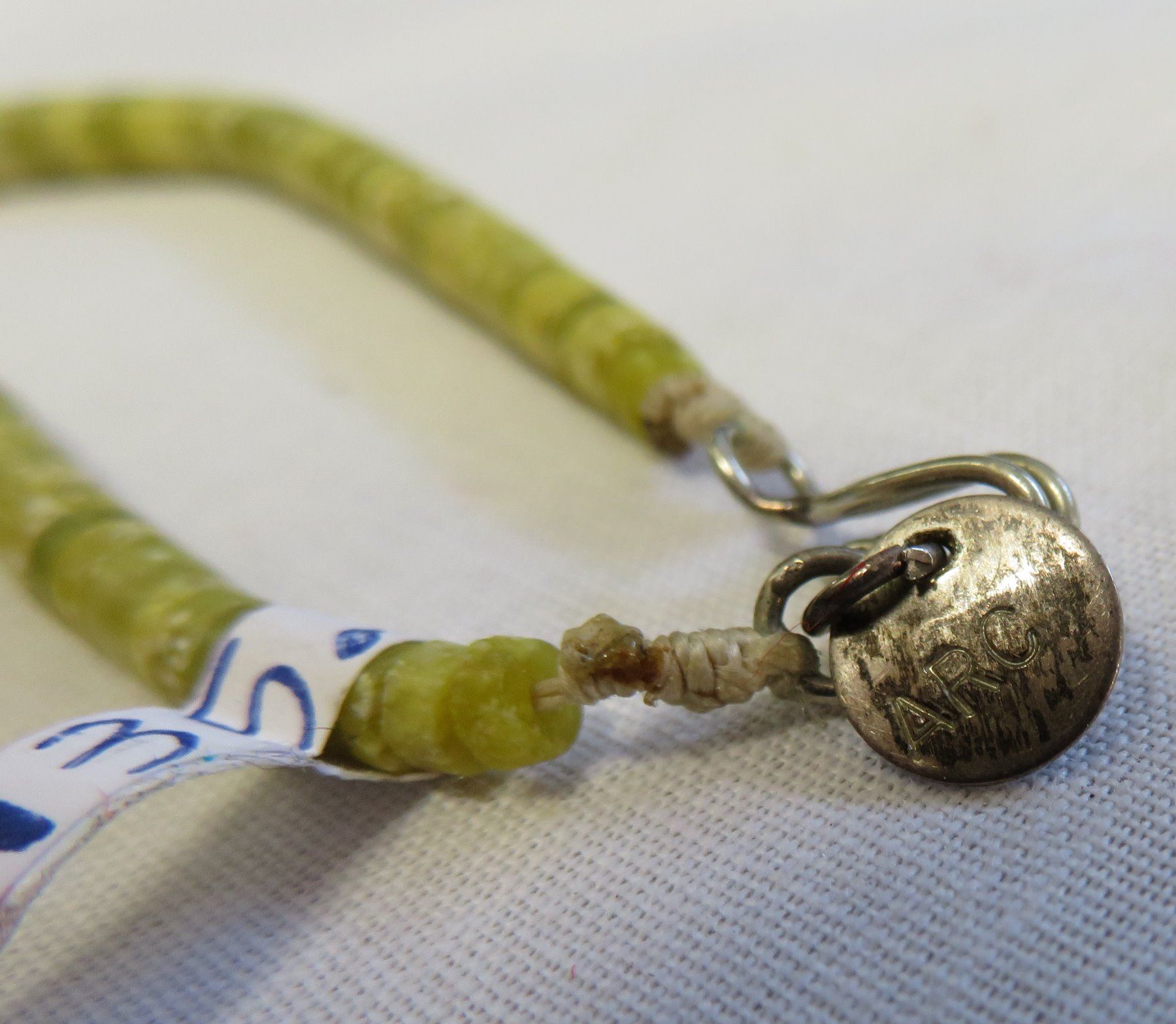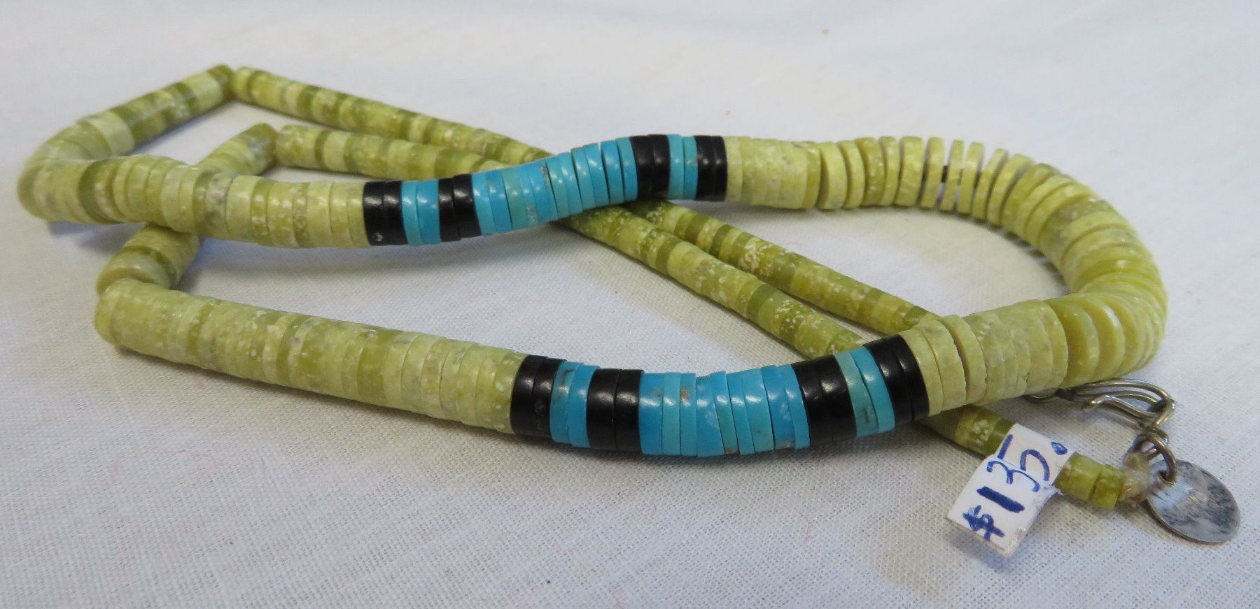 Zuni Heishi Necklace, c. 1960s. Made of stone, turquoise, jet and string, the item hangs about 11" as worn. Marked ARC-JRC. Pretty necklace with nice blue turquoise pieces which catch the eye. Condition: Good, some wear, see images. Shipping: $14.50 w/insurance and signature.