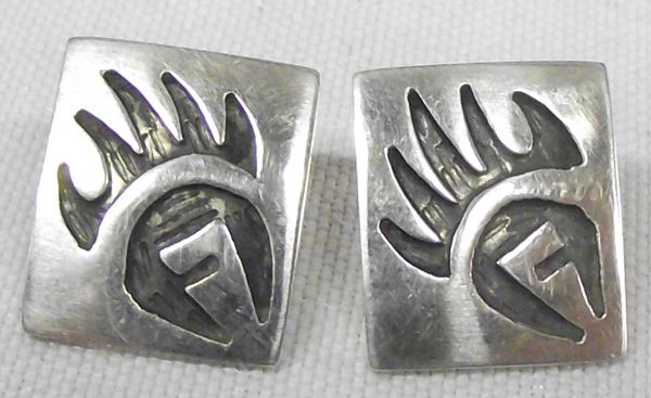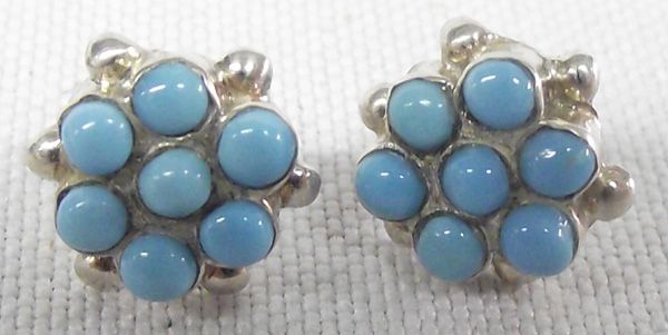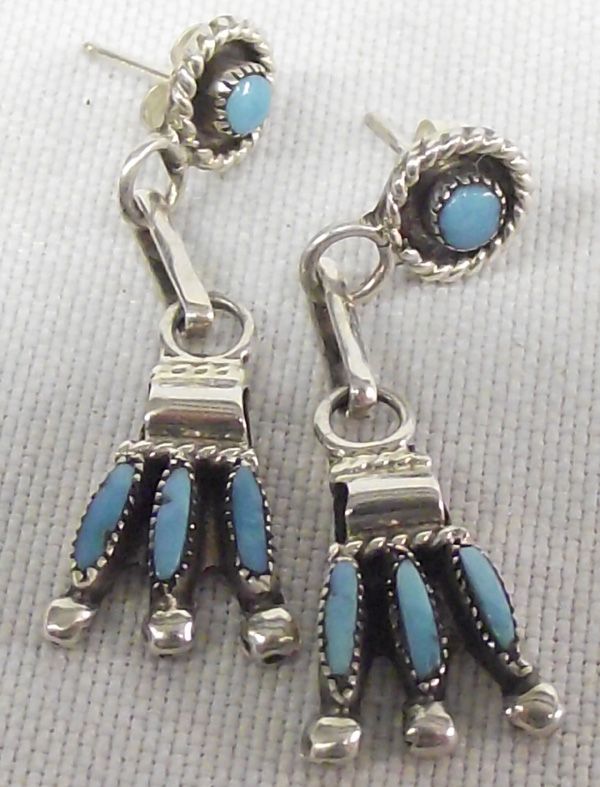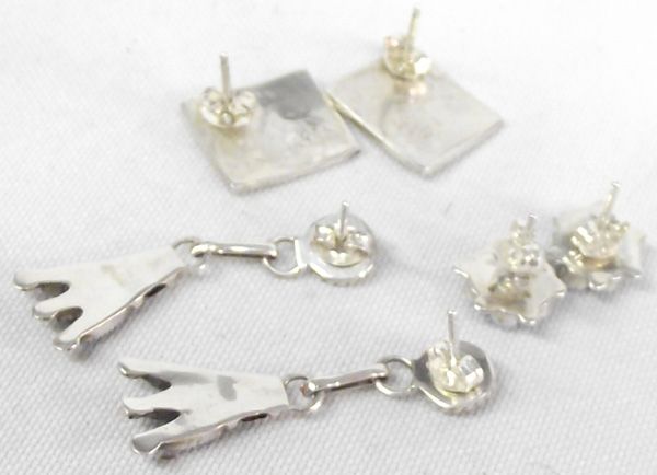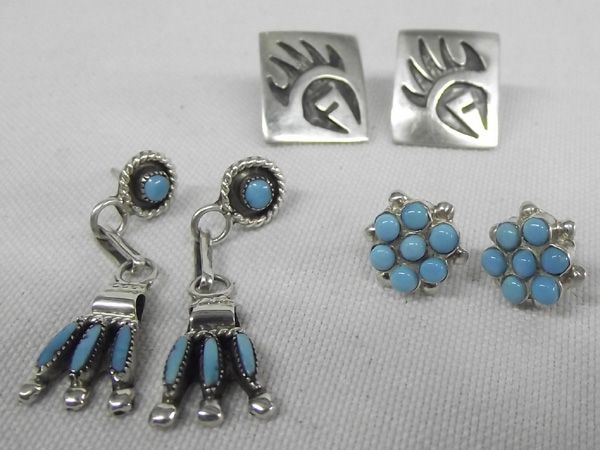 Zuni & Hopi Pierced Sterling Turquoise Earrings, #1 Pair Zuni Petit Point Turquoise Sterling Flower Earrings .5''D #2 Zuni Petit Point & Needlepoint Turquoise Sterling Dangle Earrings by Etsate #3 Hopi Silver Overlay Bear Paw Pierced Earrings by Clement Honie, longest measures 1 3/8''L, nice collection
