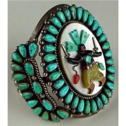 Zuni Indian Cuff Bracelet. Turquoise, Mother of Pearl & Natural Stone. Estimate $300 - $600.