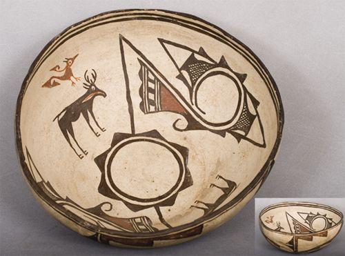 Zuni Indian Dough Bowl. 13 ½” diameter, 5 ½” tall. Red and black designs on white slip. 1890s. Fine condition. (est $5,000-6,000).