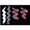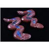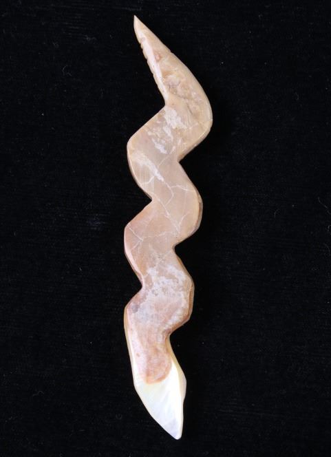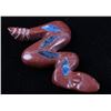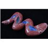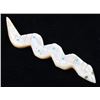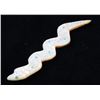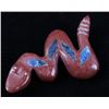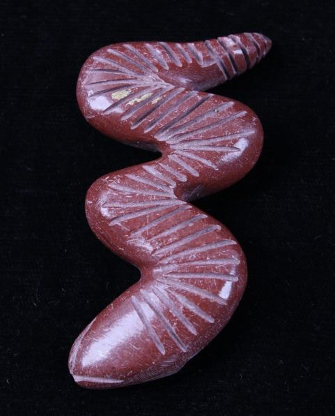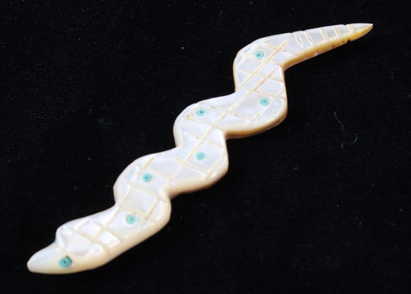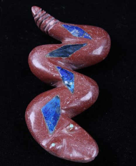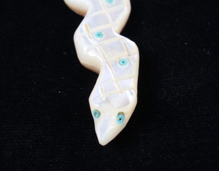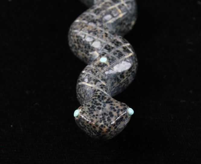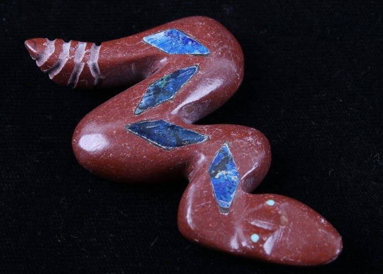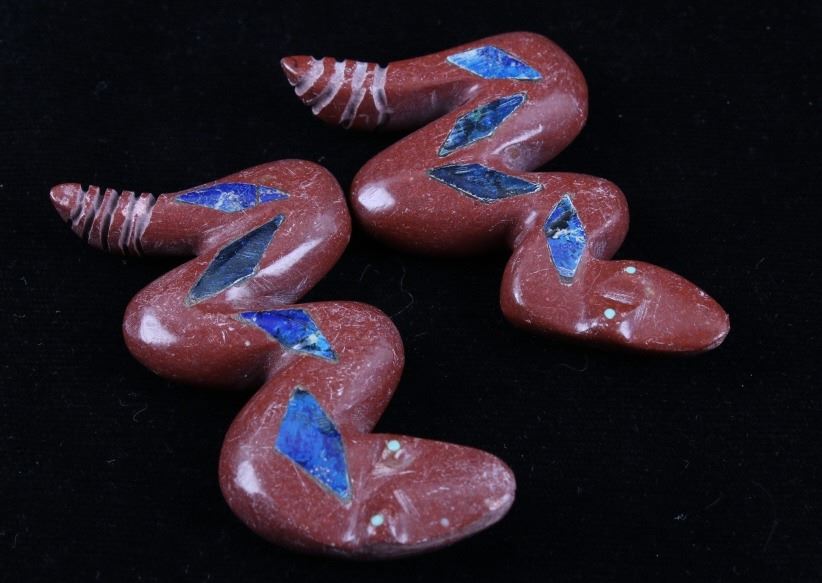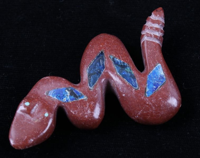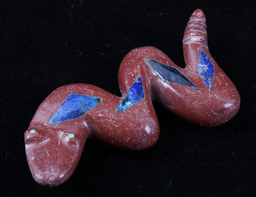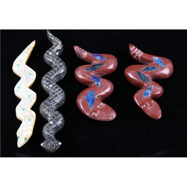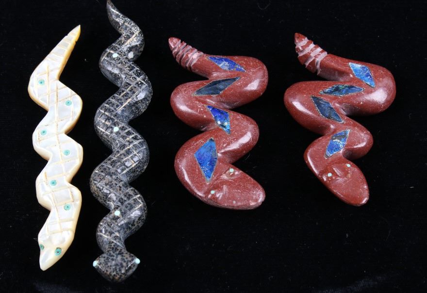 Featured in this lot is a collection of hand carved Zuni Native American snake fetishes. The collection consists of four hand carved rattle snake fetishes. The first of the snakes displays soapstone construction with hand carved checkered pattern across the back, turquoise eyes, and three turquoise dots across the back. The second snake features mother of pearl construction with carved designs, turquoise eyes, and six turquoise dots across the back. The final two fetishes display pipestone construction with turquoise eyes and geometric designs of lapis lazuli across the back. The collection shows good condition overall and some light wear. The largest of the snakes measures 4 1/2" long by 3/4" wide.