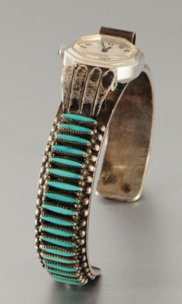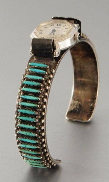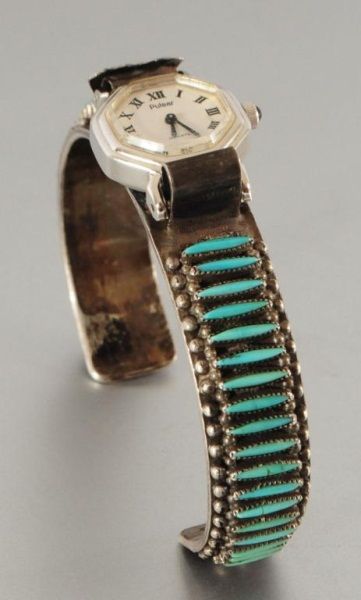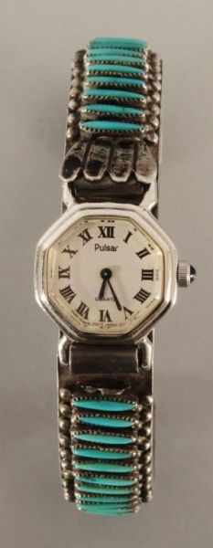 Signed B.Waatsa Zuni petit point style sterling silver and turquoise ladies watch band with Pulsar watch, does not wind or tick.