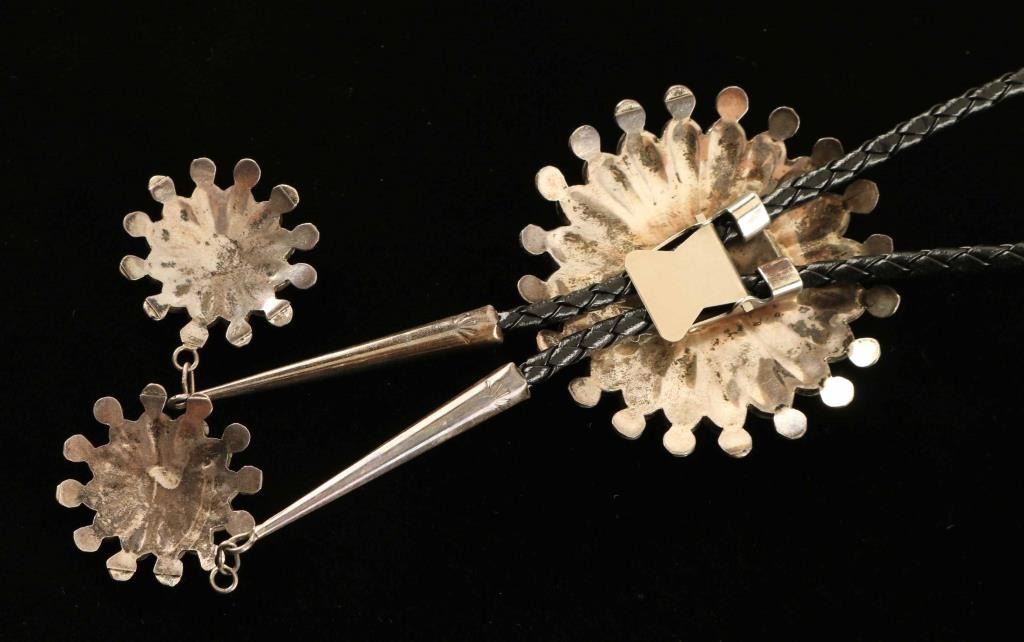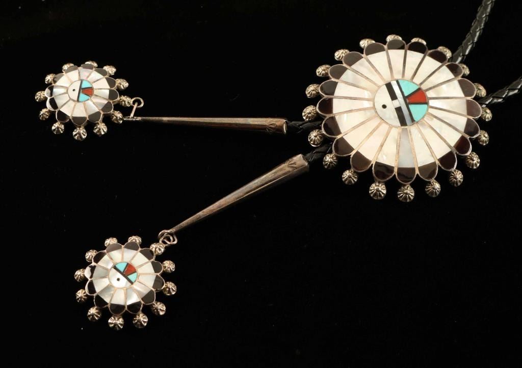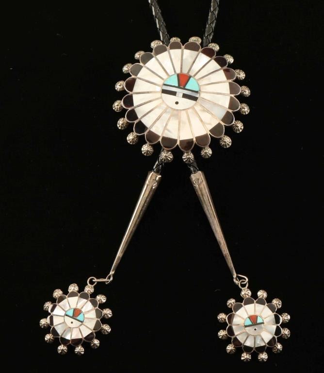 Sunface bolo with mother of pearl, jet, turquoise and coral inlay set in sterling silver 2 3/4" dia. with matching sunface tips on a black leather braided cord.