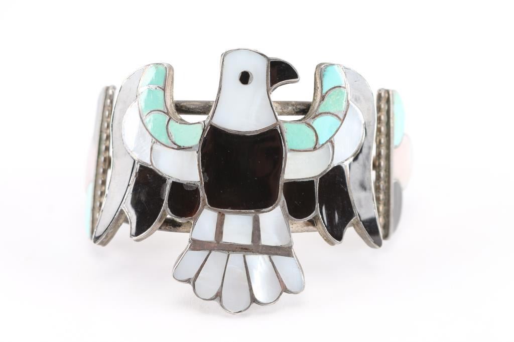 Inlaid with mother of pearl, turquoise, and jet set in sterling silver. Measures with the gap 8".