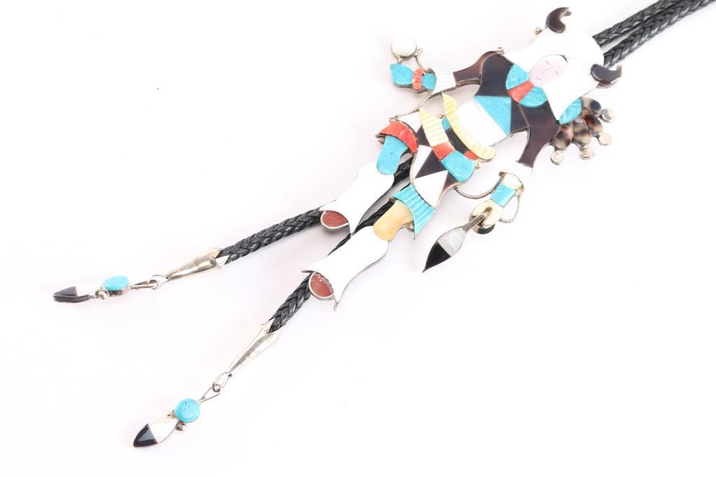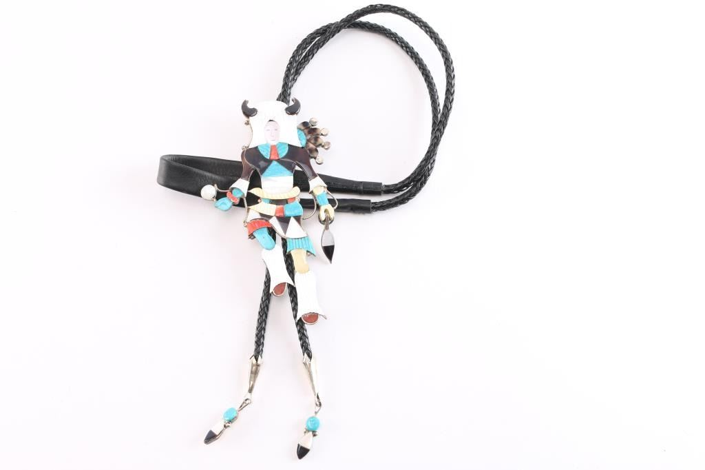 Crafted by Zuni artist Johnathon Beyuka, the fully inlaid dancer is between 5-1/2" to 6" tall and about 3" wide. Made with genuine Mother of Pearl, Turquoise, Gold Lip, Jet and Spiny Oyster set in Sterling. He is magnificent and the feather in his left hand is removable and can be worn as a tie tack. Including the custom dangles, it's 48" end to end, and is hallmarked. This Zuni Inlaid Buffalo Dancer Bolo Tie is one of a kind and exceptional in size and quality craftsmanship.