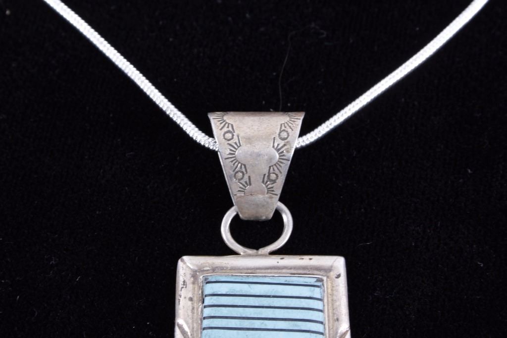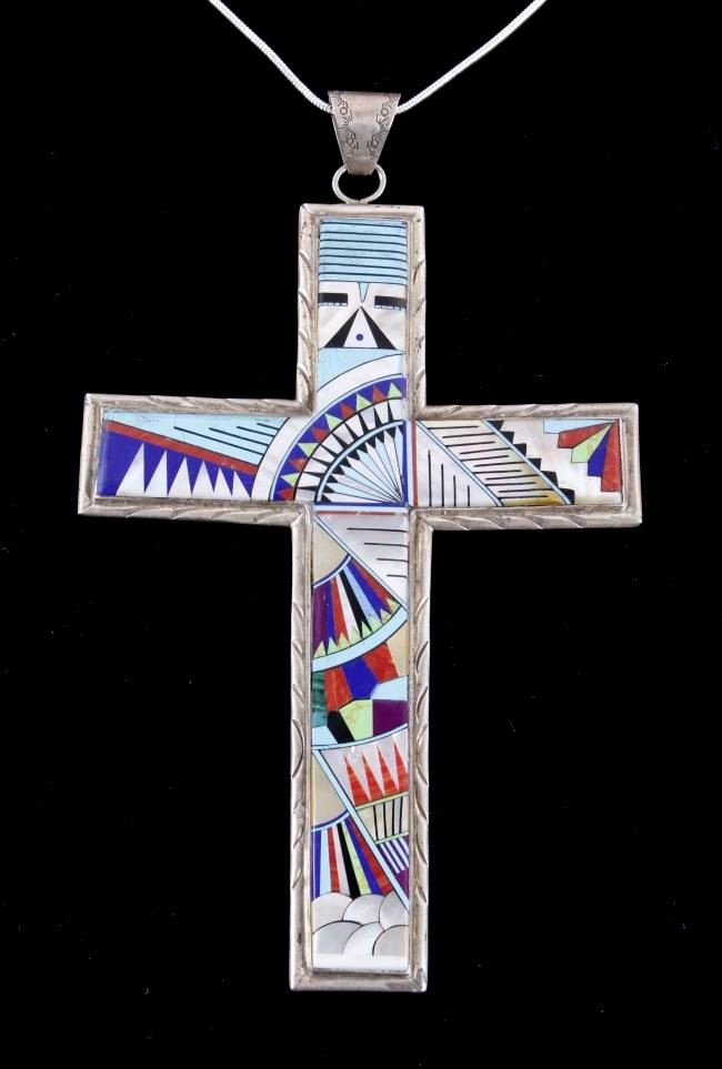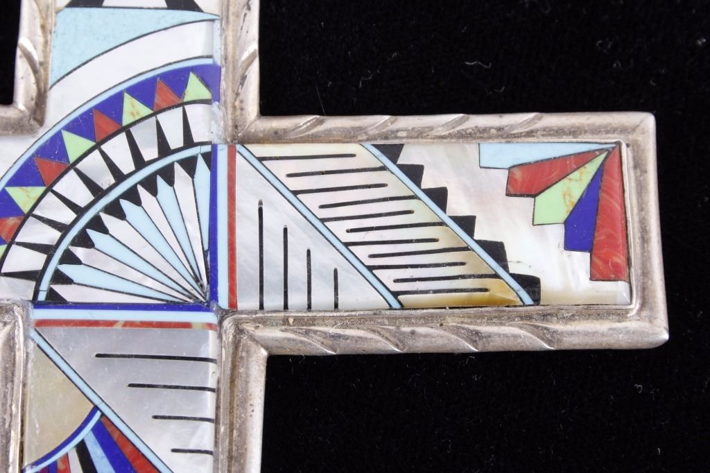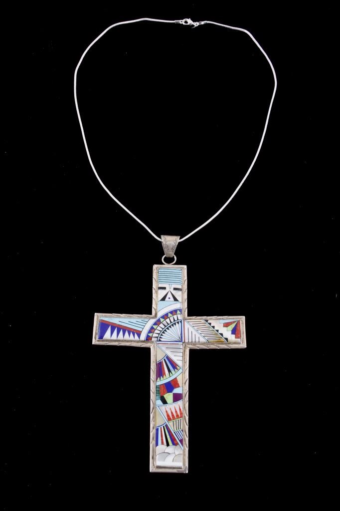 This is an excellent very large inlaid mosaic sterling silver cross pendant from the Zuni Native American Indian master silversmith, Mary Youngblood. The large cross pendant shows an exquisite pattern with such rare gem quality stones as Sleeping Beautiy Turquoise, Mother of Pearl, Black Onyx, Lapis Lazuli, Ox Blood Coral, Malachite, Sugilite, Pink Spiny Oyster, and rare Gaspeite. The piece is hallmarked on the reverse, "M.Y. STERLING" by Mary Youngblood. The piece is of phenomenal size and quality. This shows an etched concho style top bail on a .925 marked necklace. Pendant is 4 3/8"x6 5/8" with a 23"L sterling silver chain.