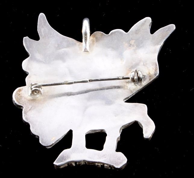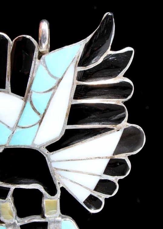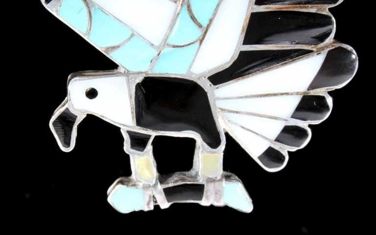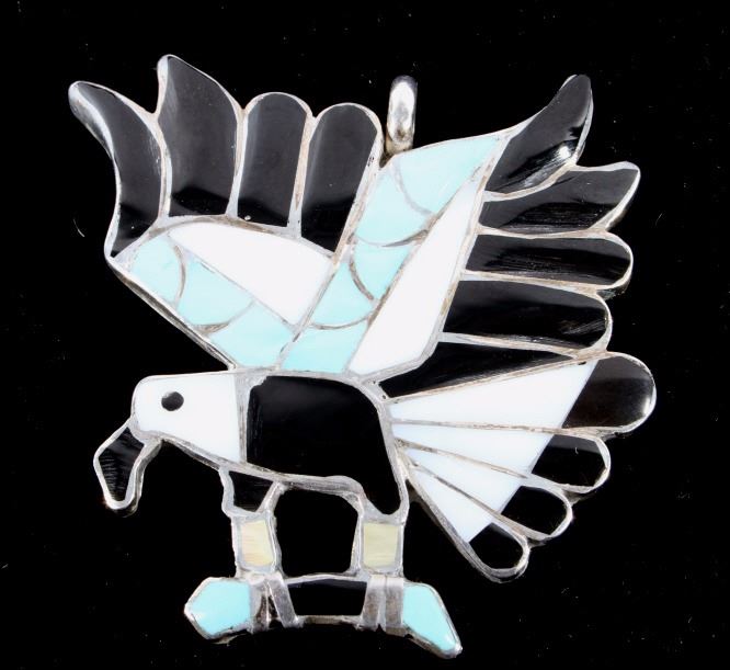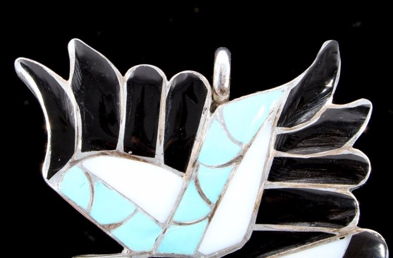 This is an inlaid mosaic brooch or pendant with a wonderful flying hawk effigy design. The old pawn piece is constructed of sterling silver and shows wonderful inlaid stones such as black onyx, mother of pearl, and turquoise. The piece has a pin back and also a top loop for use as a necklace pendant. Measures 1 7/8"x2".