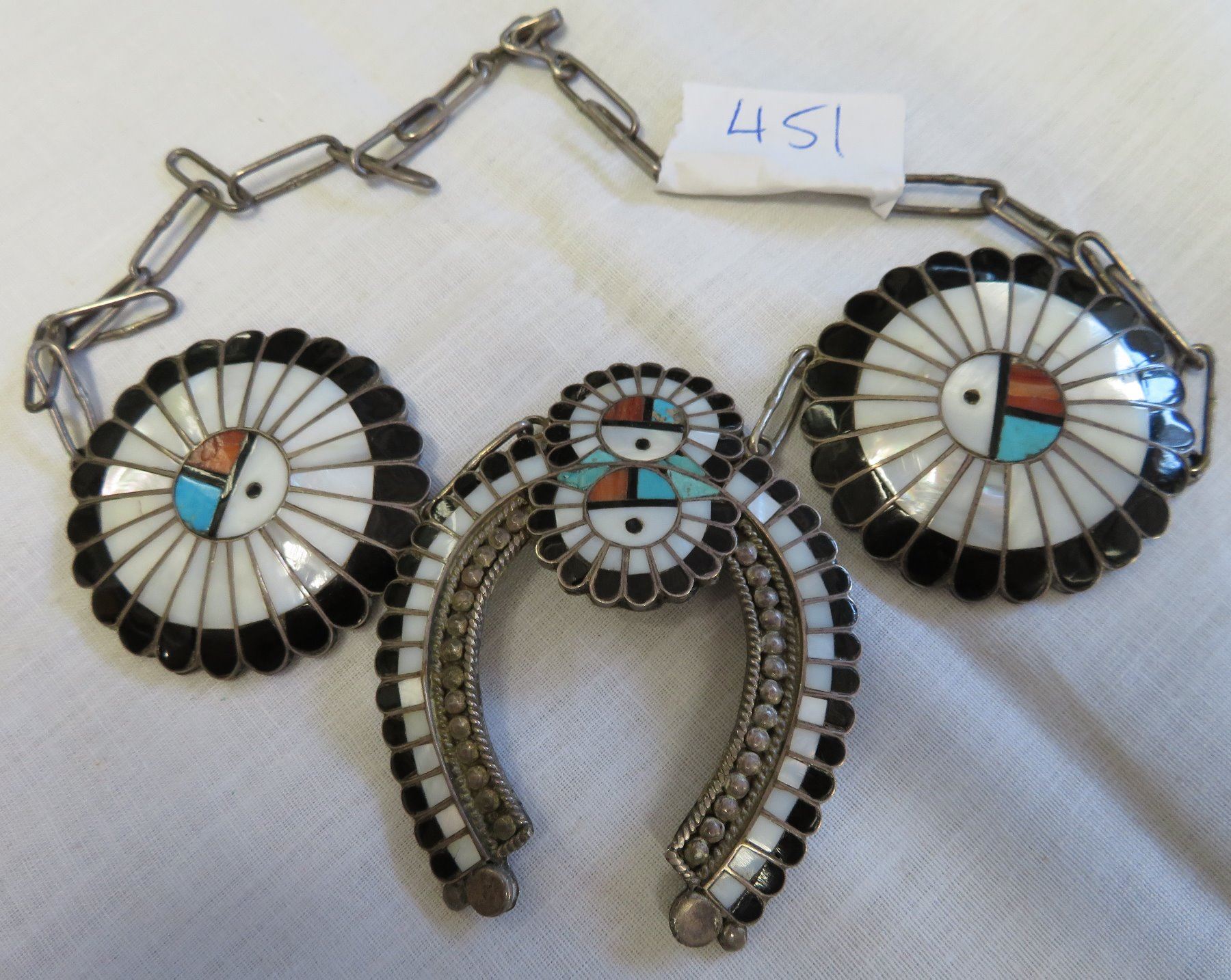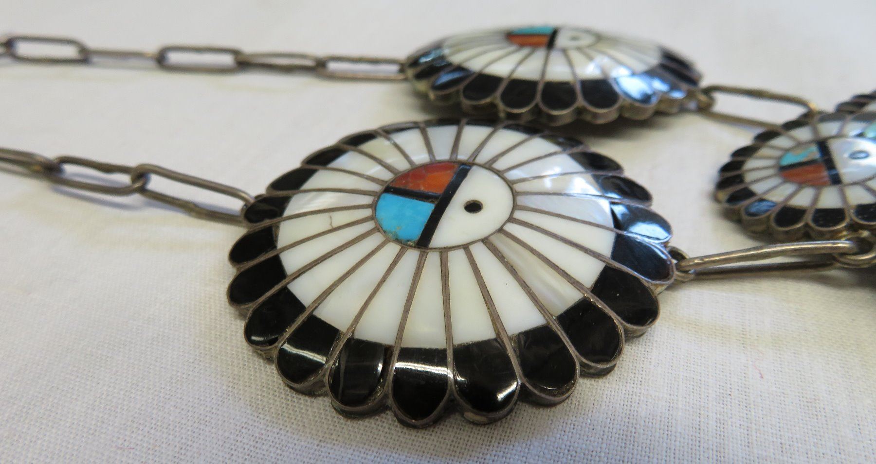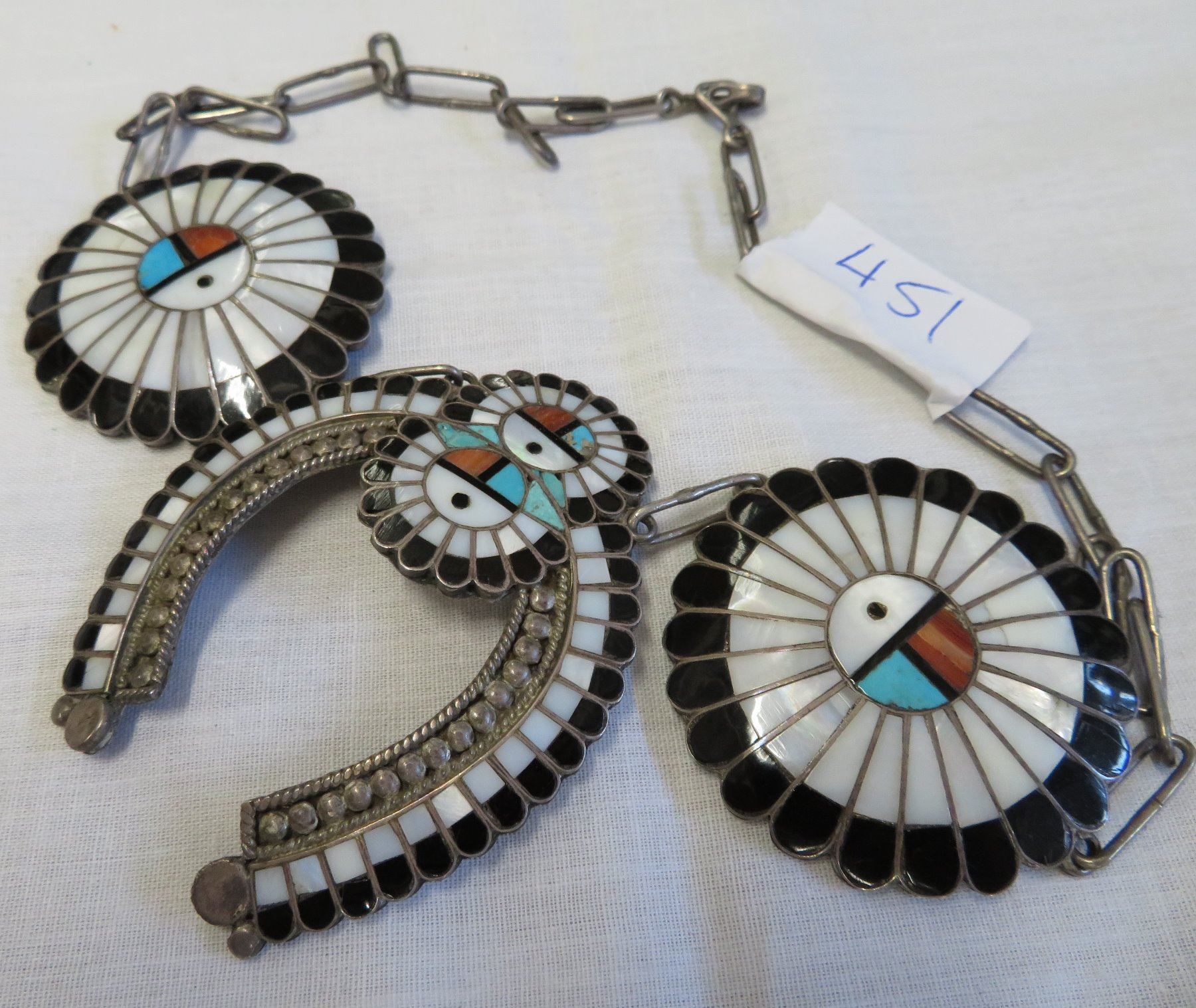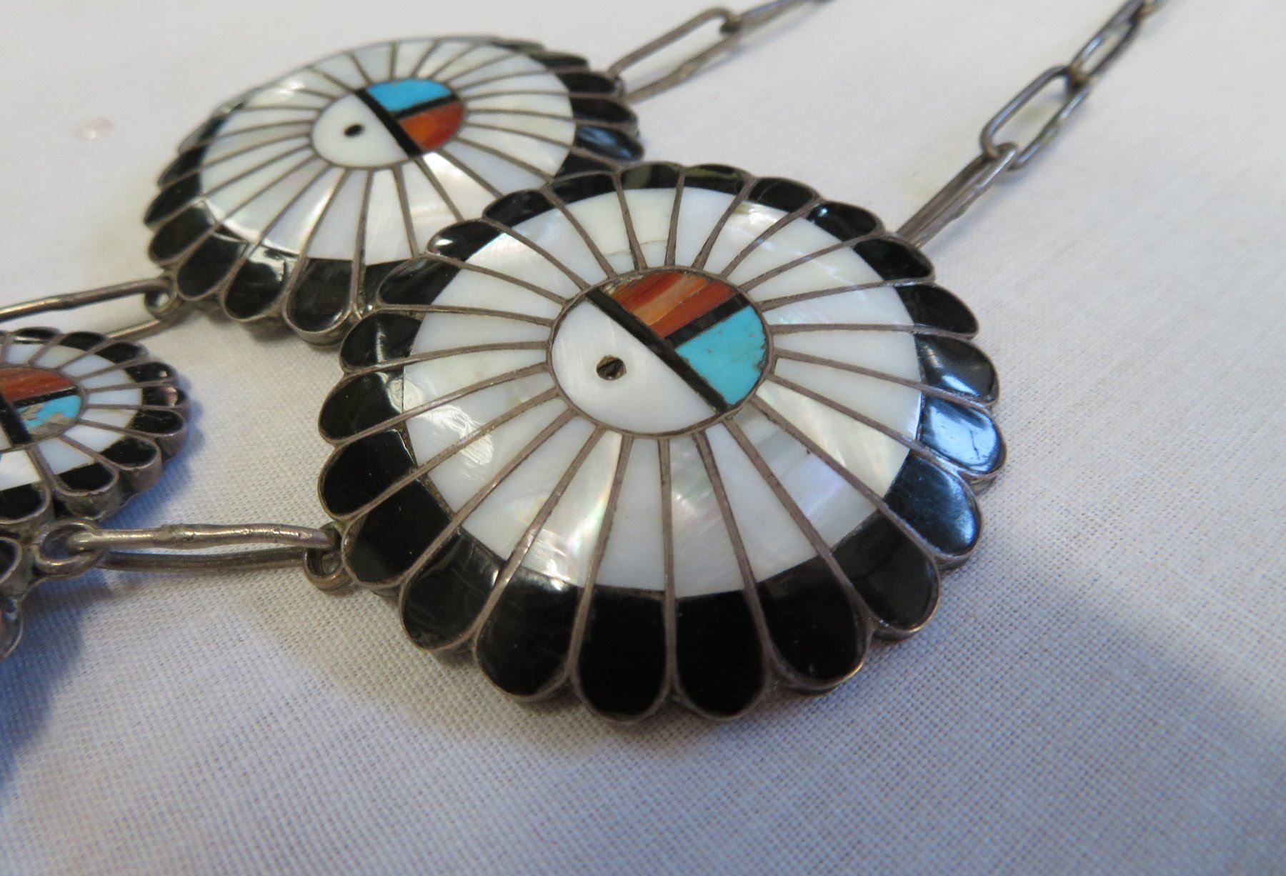 Zuni Inlaid Sun Face Necklace, c. 1940s. Made of sterling silver, mother of pearl, coral, turquoise and jet, the item hangs about 11" as worn w/naja. Naja measures 2 1/2" x 3" and sun faces 2". Zuni, New Mexico. Stone-to-stone work throughout, very fine silver work on naja. Condition: Good, nice patina, see images. Shipping: $18.50 w/insurance and signature, due to value.
