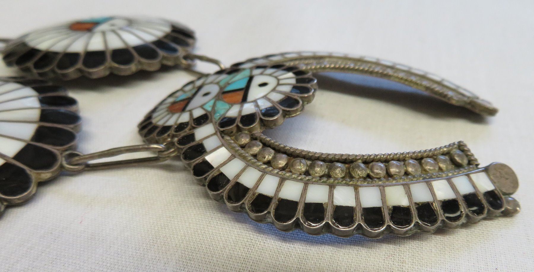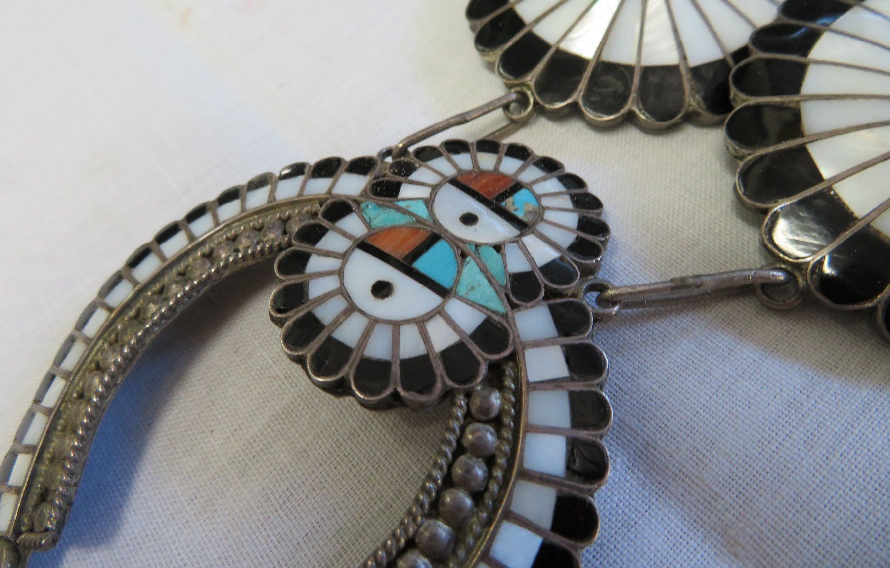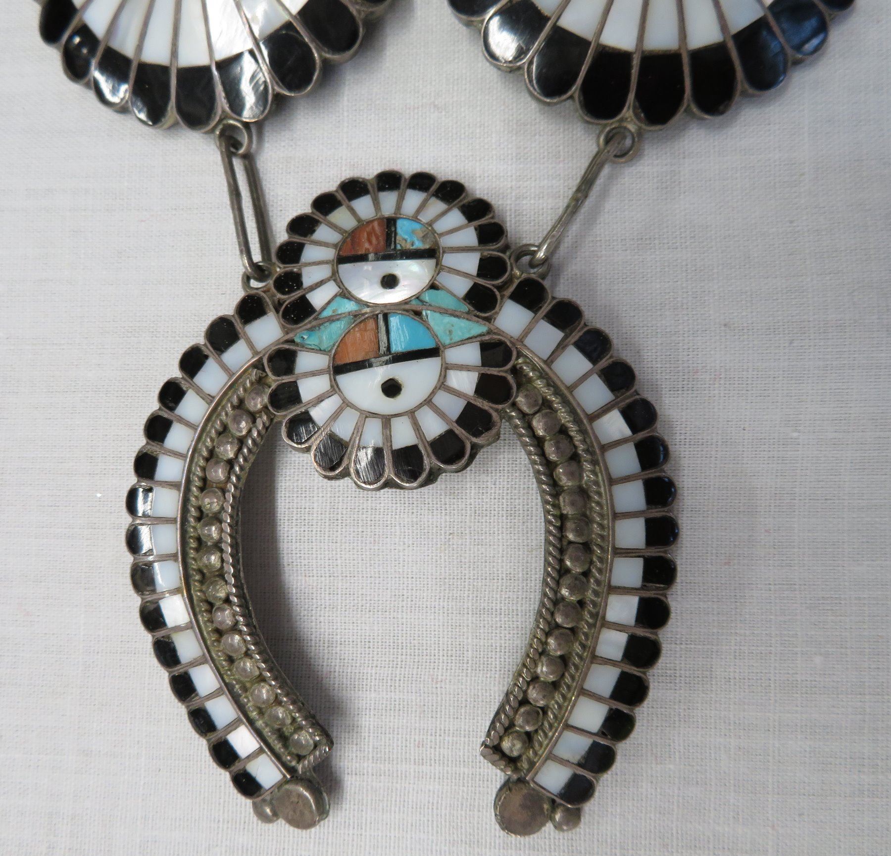Zuni Inlaid Sun Face Necklace, c. 1940s. Made of sterling silver, mother of pearl, coral, turquoise and jet, the item hangs about 11" as worn w/naja. Naja measures 2 1/2" x 3" and sun faces 2". Zuni, New Mexico. Stone-to-stone work throughout, very fine silver work on naja. Condition: Good, nice patina, see images. Shipping: $18.50 w/insurance and signature, due to value.