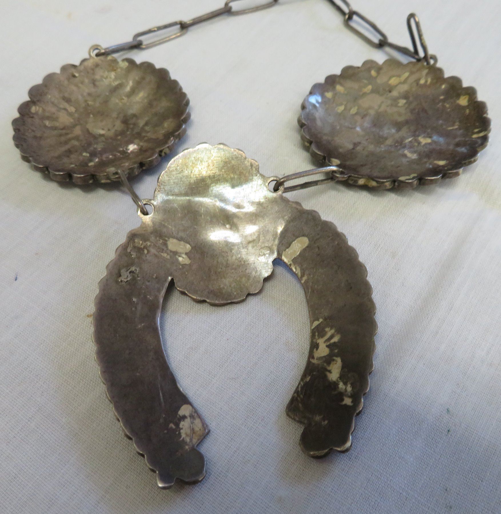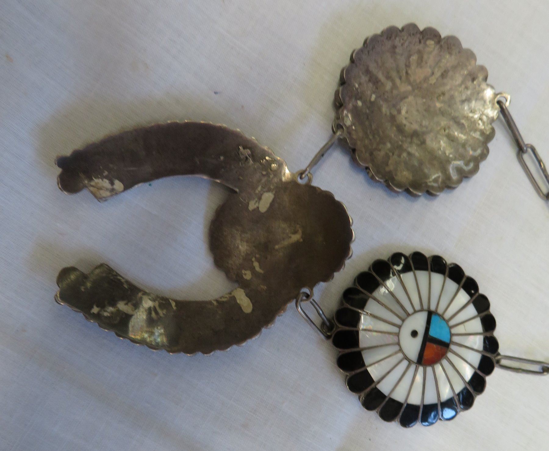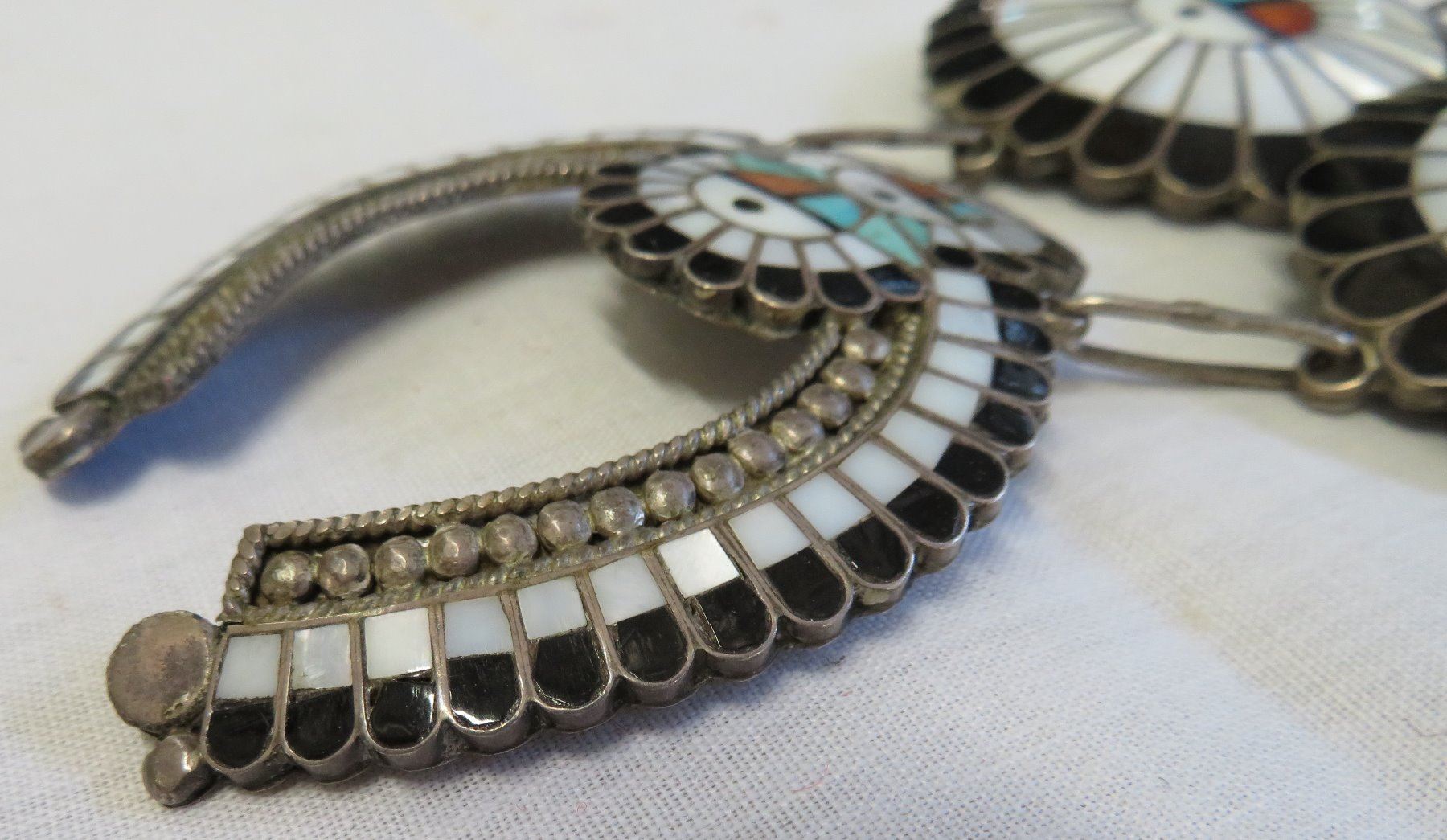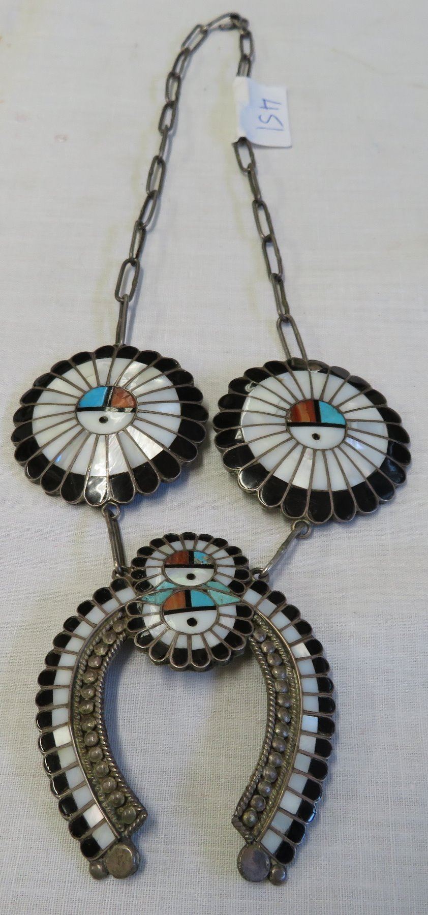 Zuni Inlaid Sun Face Necklace, c. 1940s. Made of sterling silver, mother of pearl, coral, turquoise and jet, the item hangs about 11" as worn w/naja. Naja measures 2 1/2" x 3" and sun faces 2". Zuni, New Mexico. Stone-to-stone work throughout, very fine silver work on naja. Condition: Good, nice patina, see images. Shipping: $18.50 w/insurance and signature, due to value.
