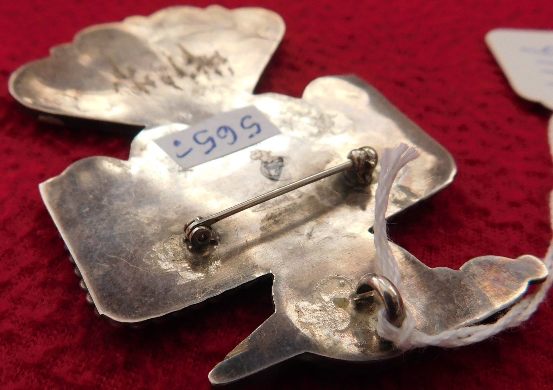 Zuni Thunderbird Pin or Pendant, circa 1960s. Made of jet, mother of pearl, turquoise, coral, and sterling silver, this item measures 3" x 2". Zuni, New Mexico. Very nice, large pin or pendant w/great color and silver rope border on wings. Condition: Nice patina, minor scuffs, see images. Shipping: $16.00 w/insurance and signature.