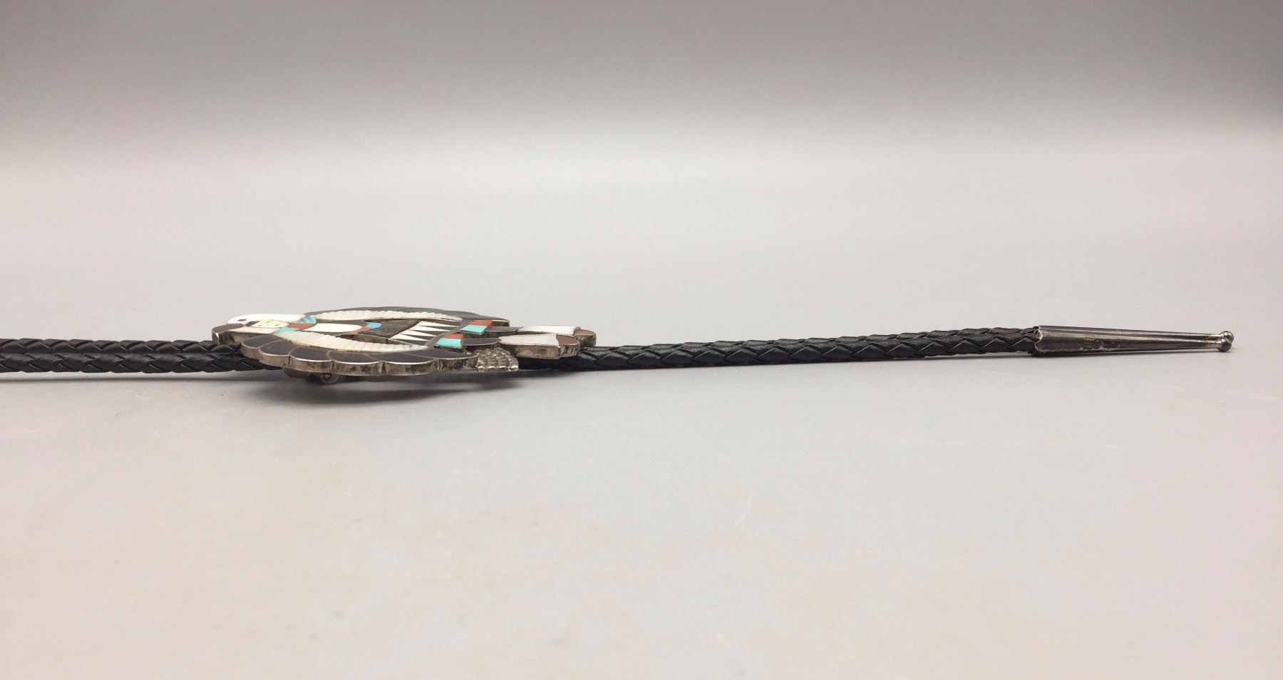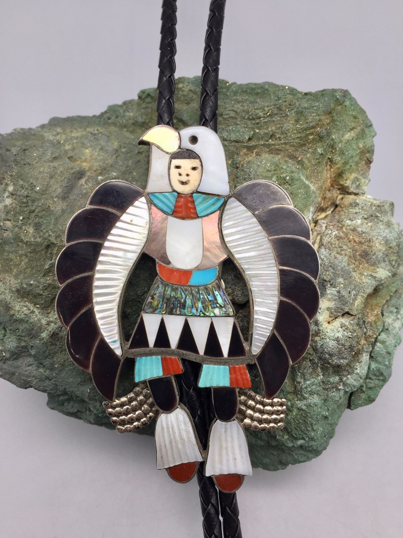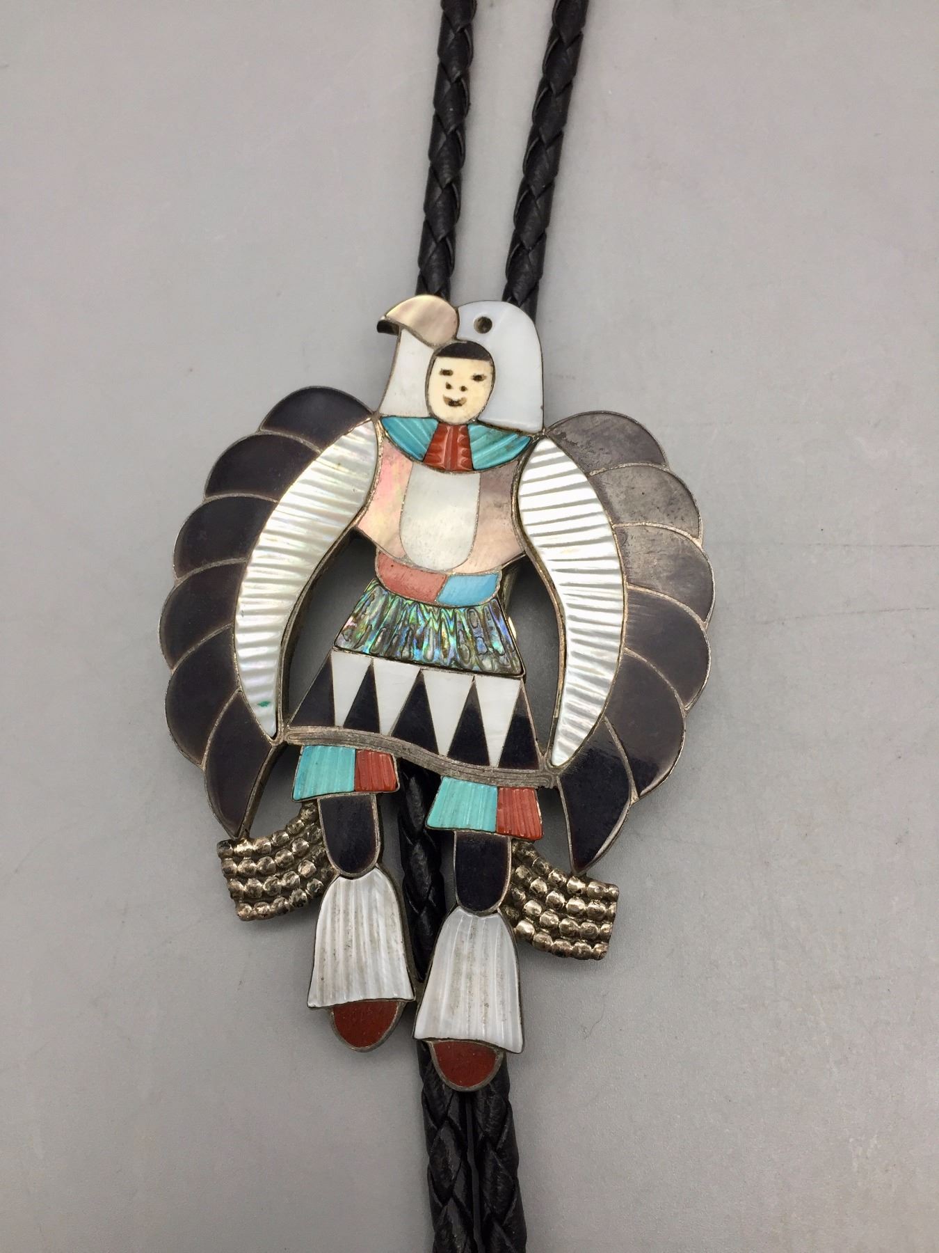 Description: Sterling silver Zuni inlay eagle dancer bolo slide with mother of pearl, turquoise, coral, etc. Maker: Hallmarked, MB. Madeline Beyuka, Zuni. Approx. Age: Vintage. Circa 1970s. Size: 36” around the neck and slide is 3” l x 2 1/4” w. Weighs 47.4 g. Condition: Good for its age, normal wear expected. Please look closely at the pictures - they are an important part of our description. Shipping: There will be a $5 handling / packaging fee for shipping this lot. The actual cost of postage will be added on top of that.