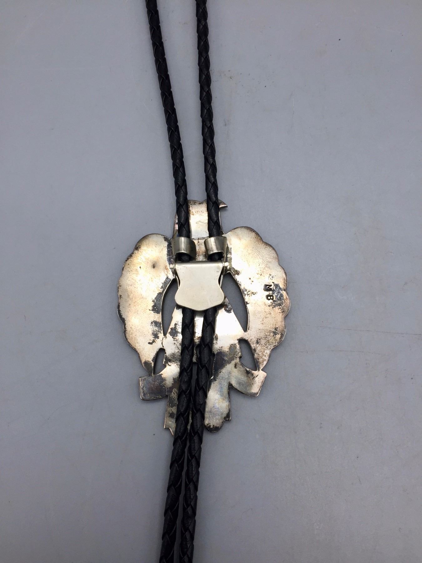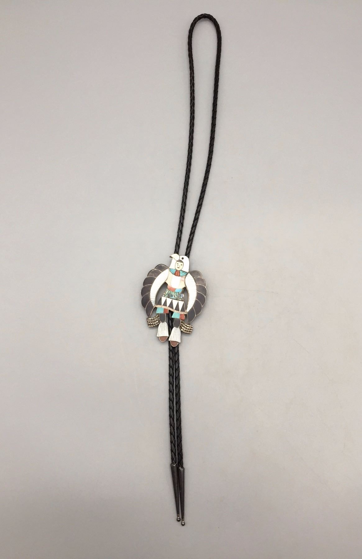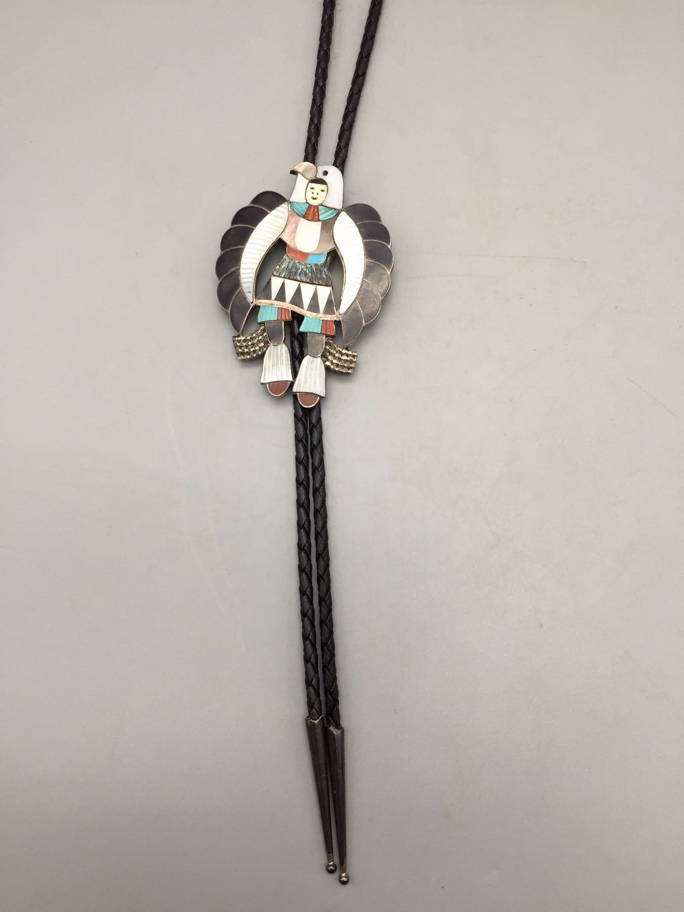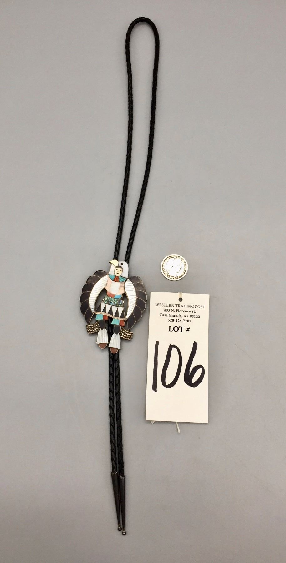 Description: Sterling silver Zuni inlay eagle dancer bolo slide with mother of pearl, turquoise, coral, etc. Maker: Hallmarked, MB. Madeline Beyuka, Zuni. Approx. Age: Vintage. Circa 1970s. Size: 36” around the neck and slide is 3” l x 2 1/4” w. Weighs 47.4 g. Condition: Good for its age, normal wear expected. Please look closely at the pictures - they are an important part of our description. Shipping: There will be a $5 handling / packaging fee for shipping this lot. The actual cost of postage will be added on top of that.