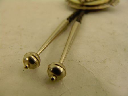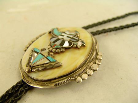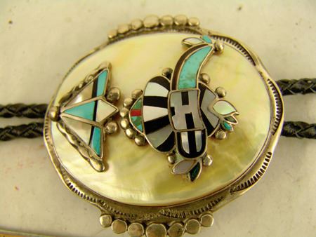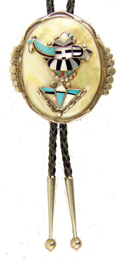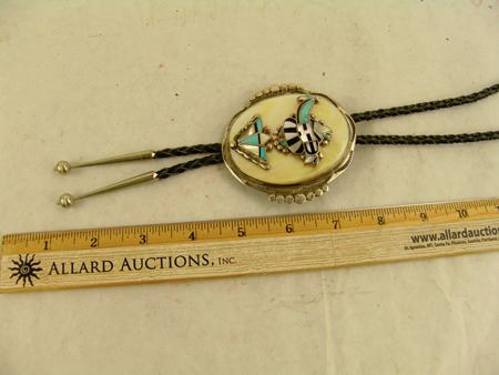 Ca. 1970s, Fine vintage all-silver bolo tie featuring a single horned kachian done in channel and mosaic inlay on a large shell disc. Very good condition. 45" long, 3" x 3"