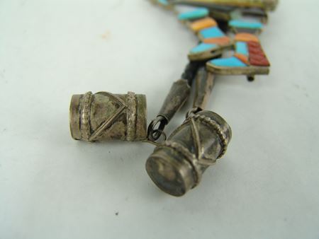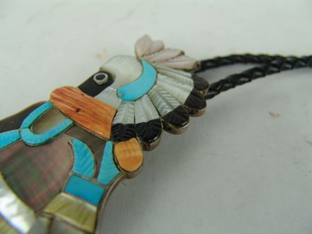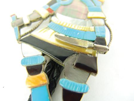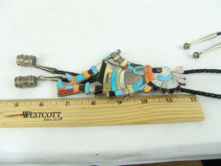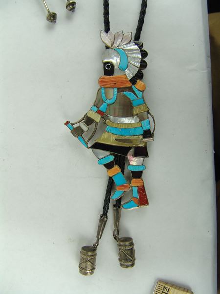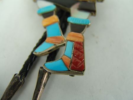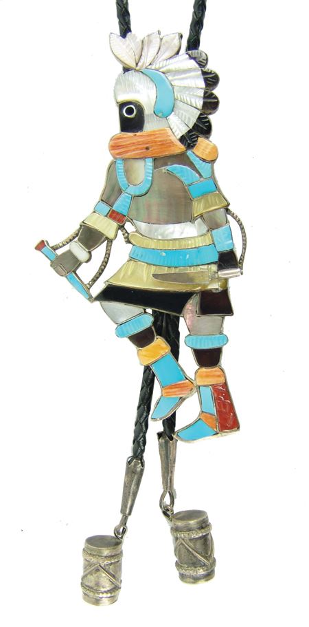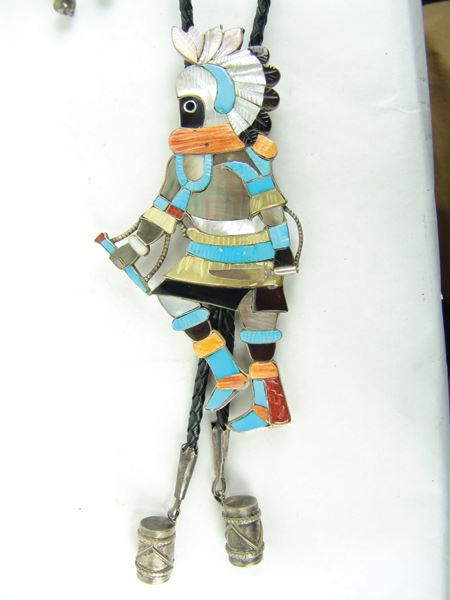 Ca. 1970s, Fantastic multi-stone channel inlay silver bolo tie, a rare depiction of the "Priest Killer" kachina. Very good condition, includes his signature silver drum tips.