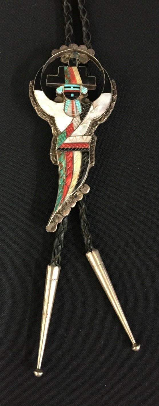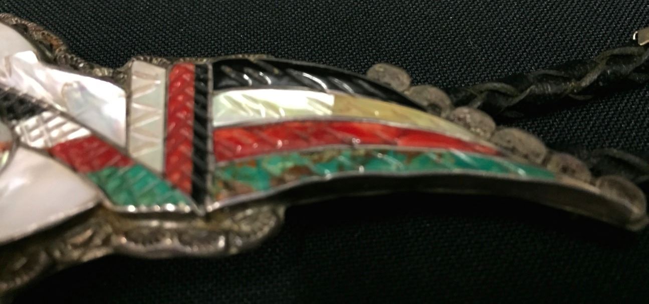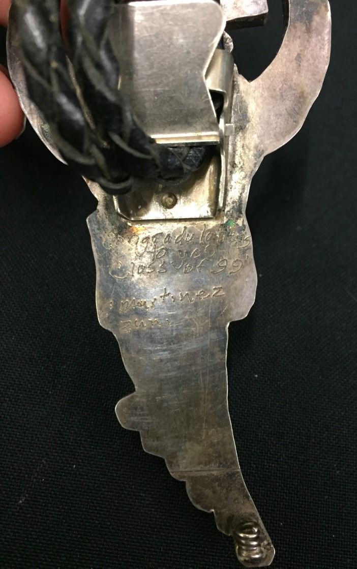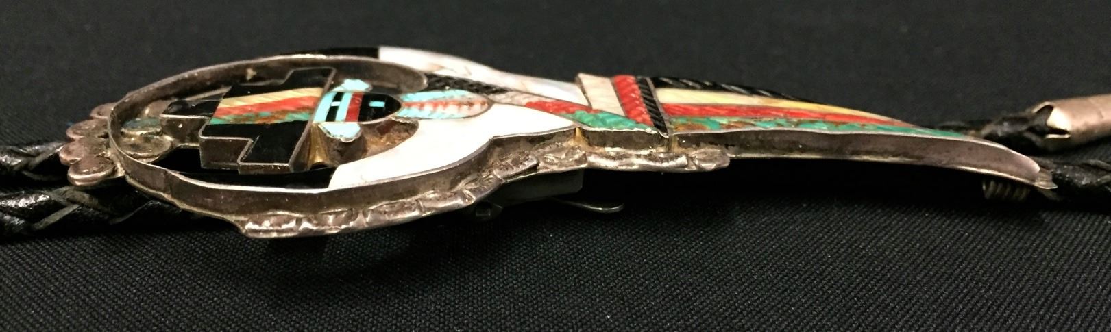 Maker: Eldred Martinez, Zuni. Approx. Age: Circa 1990s. Size: The slide is 1.75” x 4” and its on a 42” braided leather cord with sterling tips. Weighs 38.5g. with most of the cord off the scale. Condition: Good. Additional Info: Known maker who won Best-in-show at the 2016 Zuni Festival. Tested as Sterling silver. Please look closely at the pictures - they are an important part of our description. Shipping: There will be a $5 handling / packaging fee for shipping this lot. The actual cost of postage will be added on top of that.