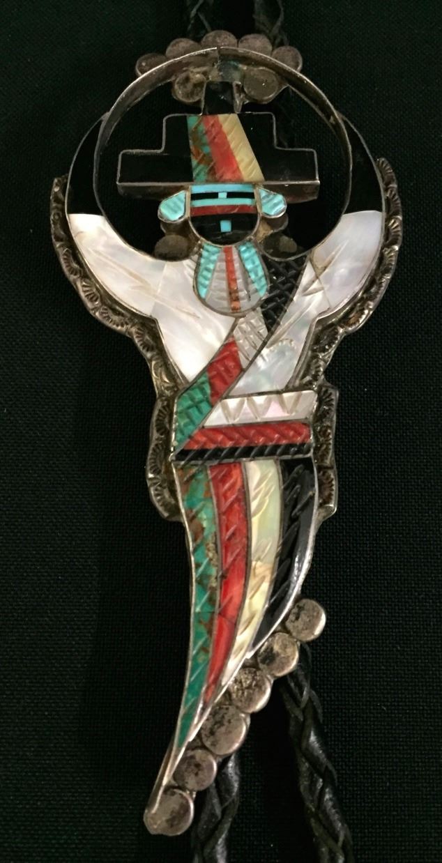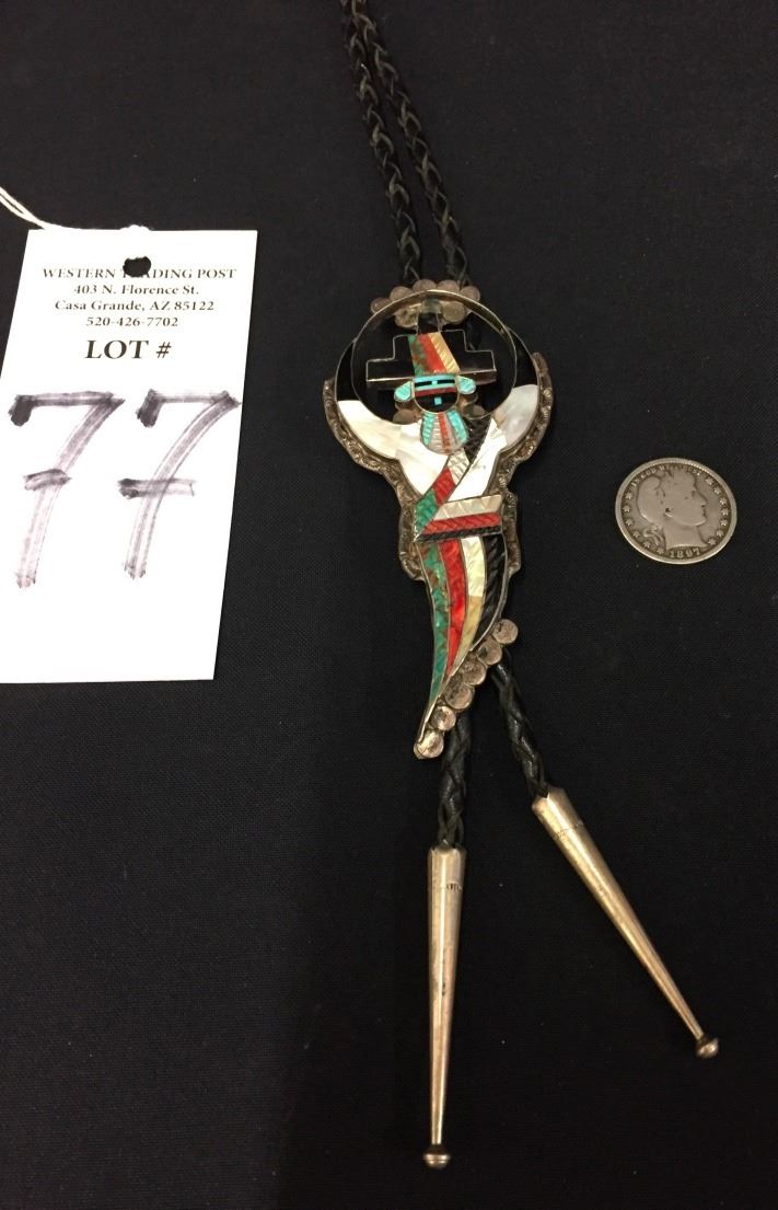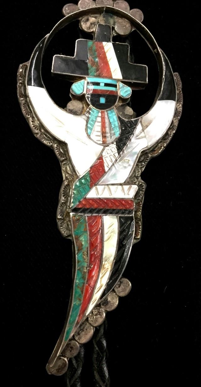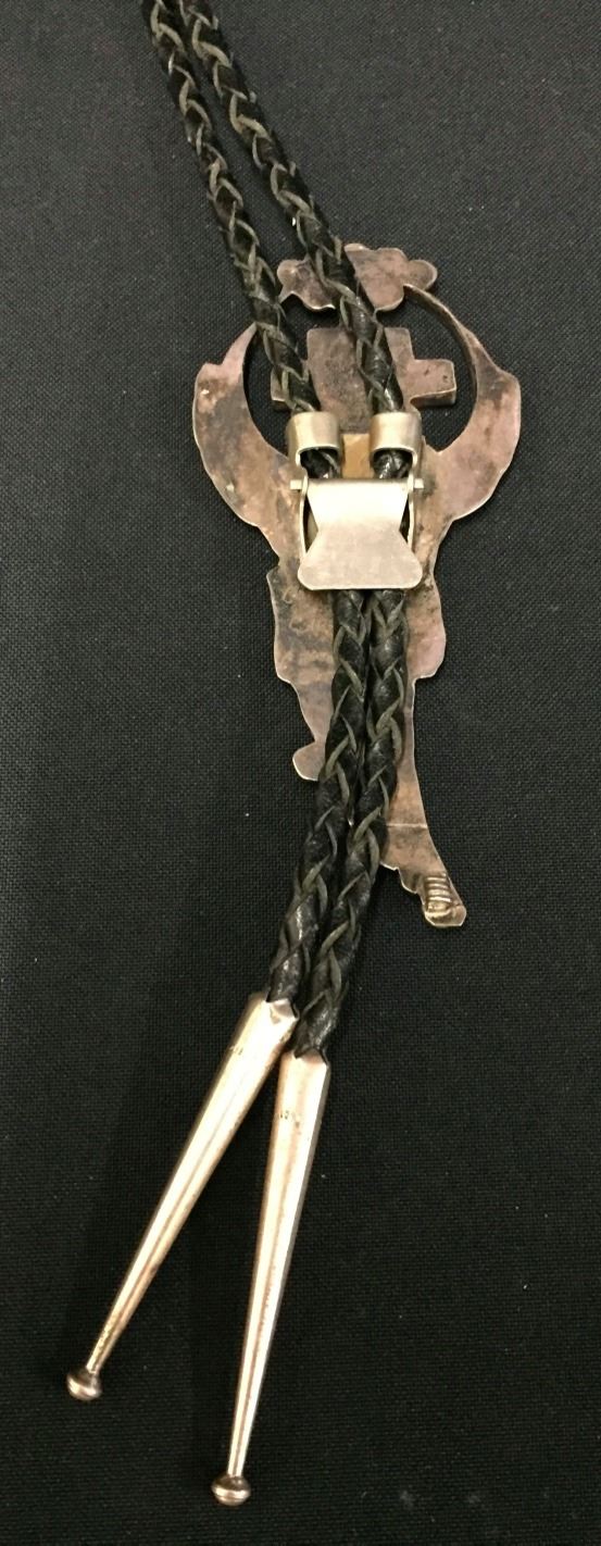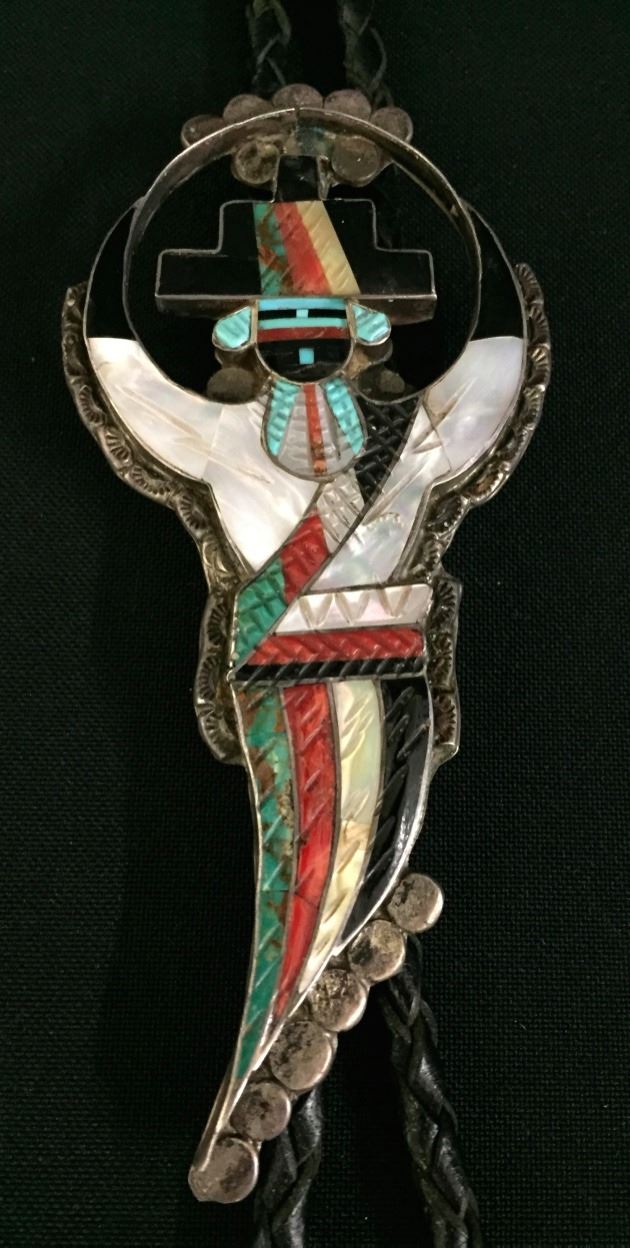 Maker: Eldred Martinez, Zuni. Approx. Age: Circa 1990s. Size: The slide is 1.75” x 4” and its on a 42” braided leather cord with sterling tips. Weighs 38.5g. with most of the cord off the scale. Condition: Good. Additional Info: Known maker who won Best-in-show at the 2016 Zuni Festival. Tested as Sterling silver. Please look closely at the pictures - they are an important part of our description. Shipping: There will be a $5 handling / packaging fee for shipping this lot. The actual cost of postage will be added on top of that.