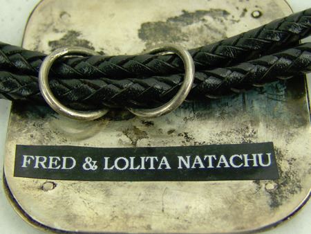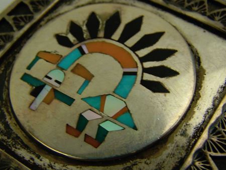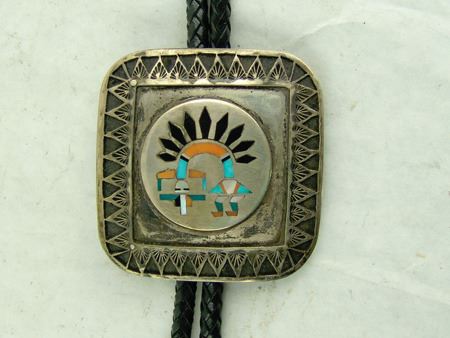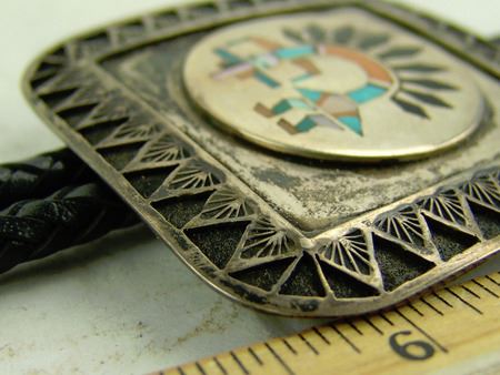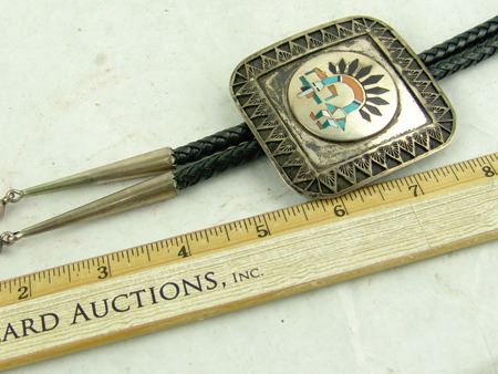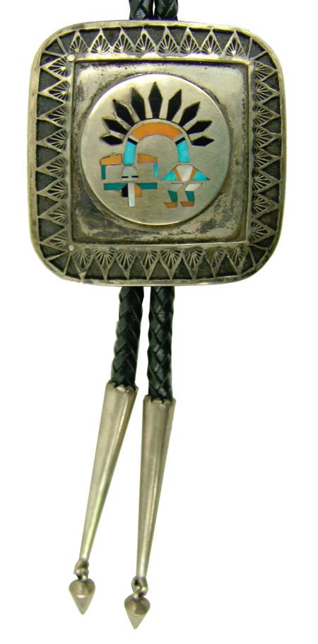 Ca. 1960s-1970s, Beautiful vintage all-silver bolo tie with channel inlay Rainbow Yei figure. Very good condition. By the husband and wife team of Fred and Lolita. 45" long, 2-5/8" x 2-5/8"