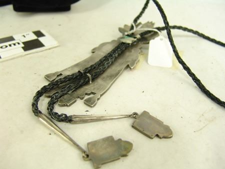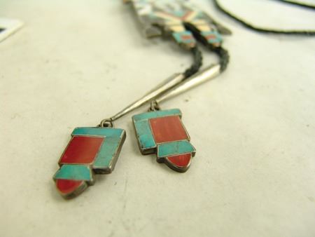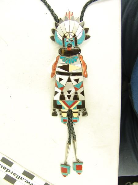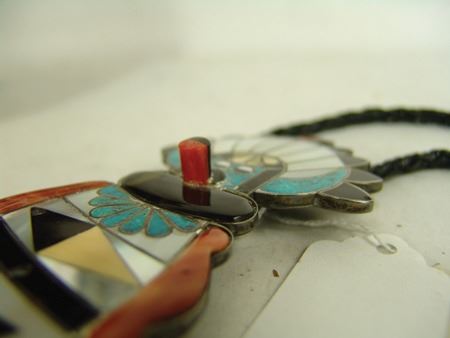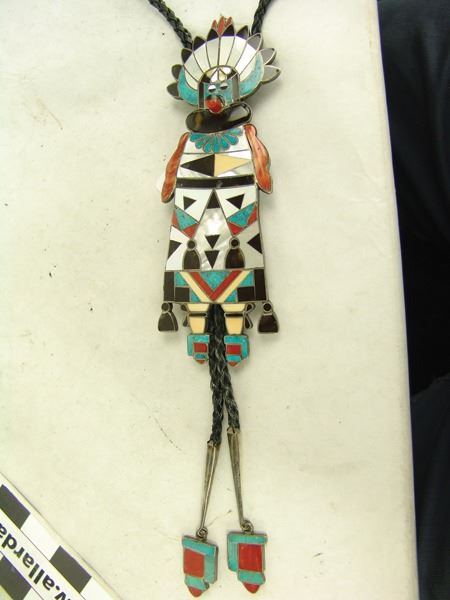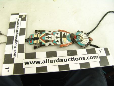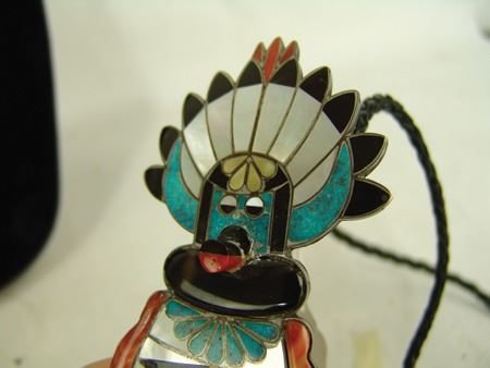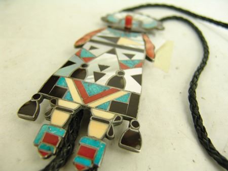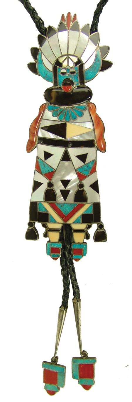 Ca. 1940s, Exquisite, early, channel inlay silver bolo tie done in great detail depicting a Shalako kachina and with custom matching tips. *This is an unsigned piece but done in his method, and has his signature tips. Very good condition. 7" x 2-1/4"
