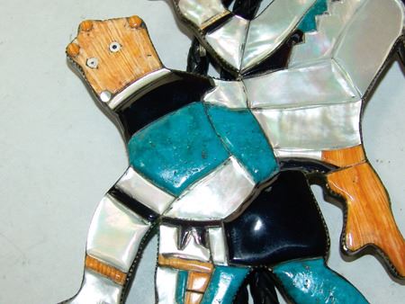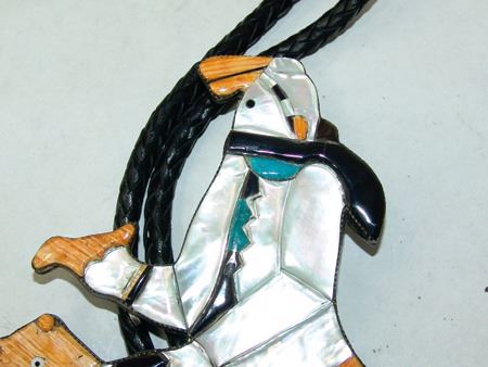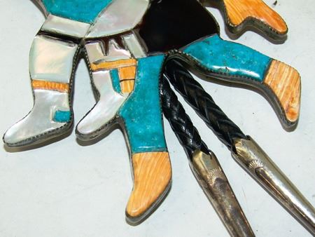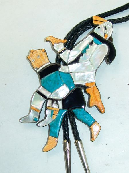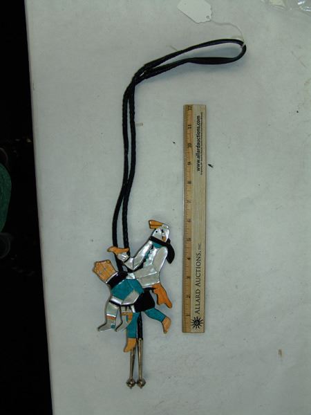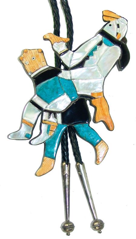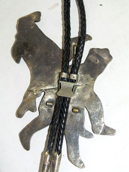 Ca. 1980s, Large and impressive silver backed bolo tie depicting a pair of "piggyback Yeis" done in traditional Zuni style with large hand-cut and set stones. This is a true showpiece and has receptors on the back for a display stand. 46" long, bolo 7" x 4"