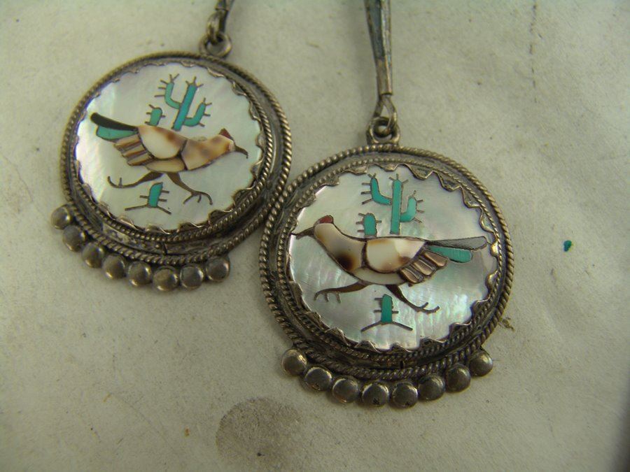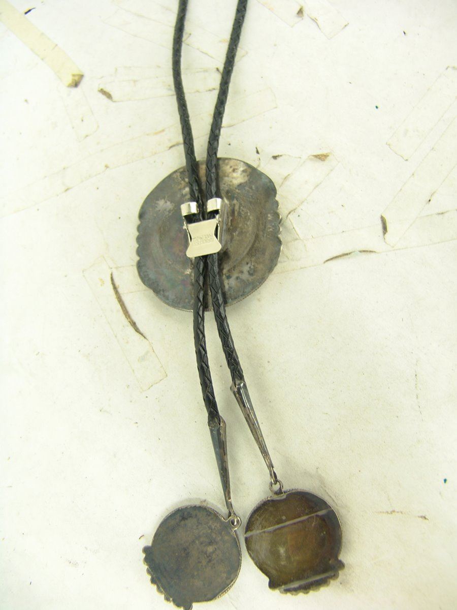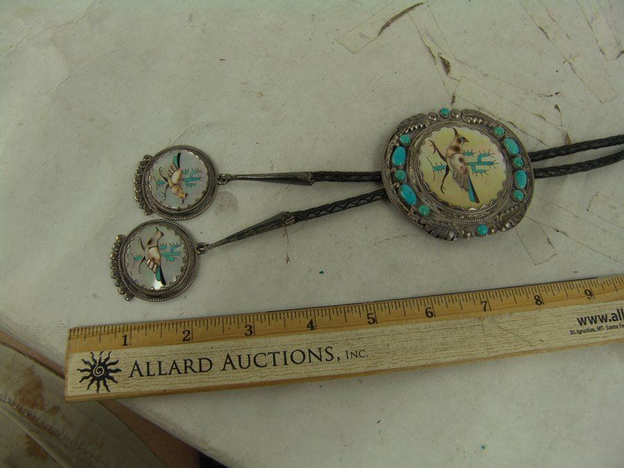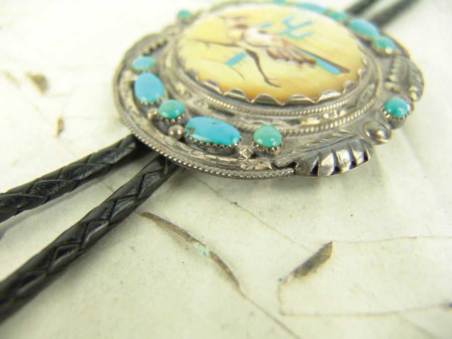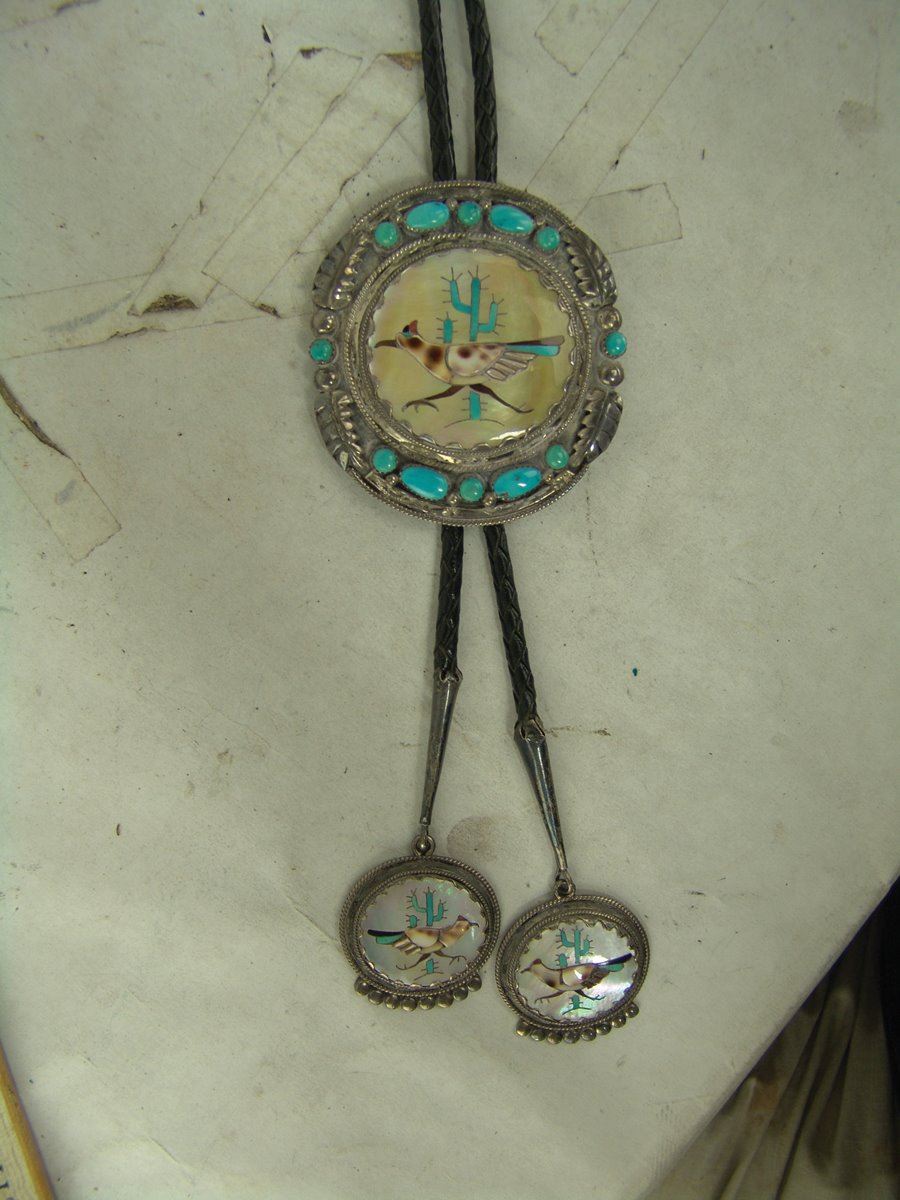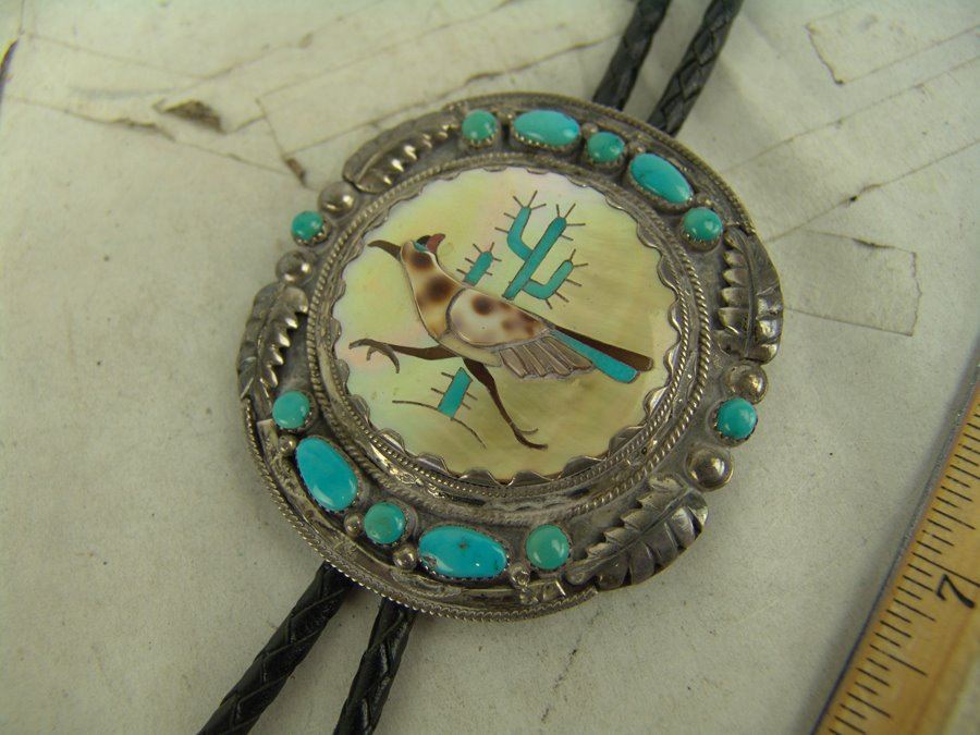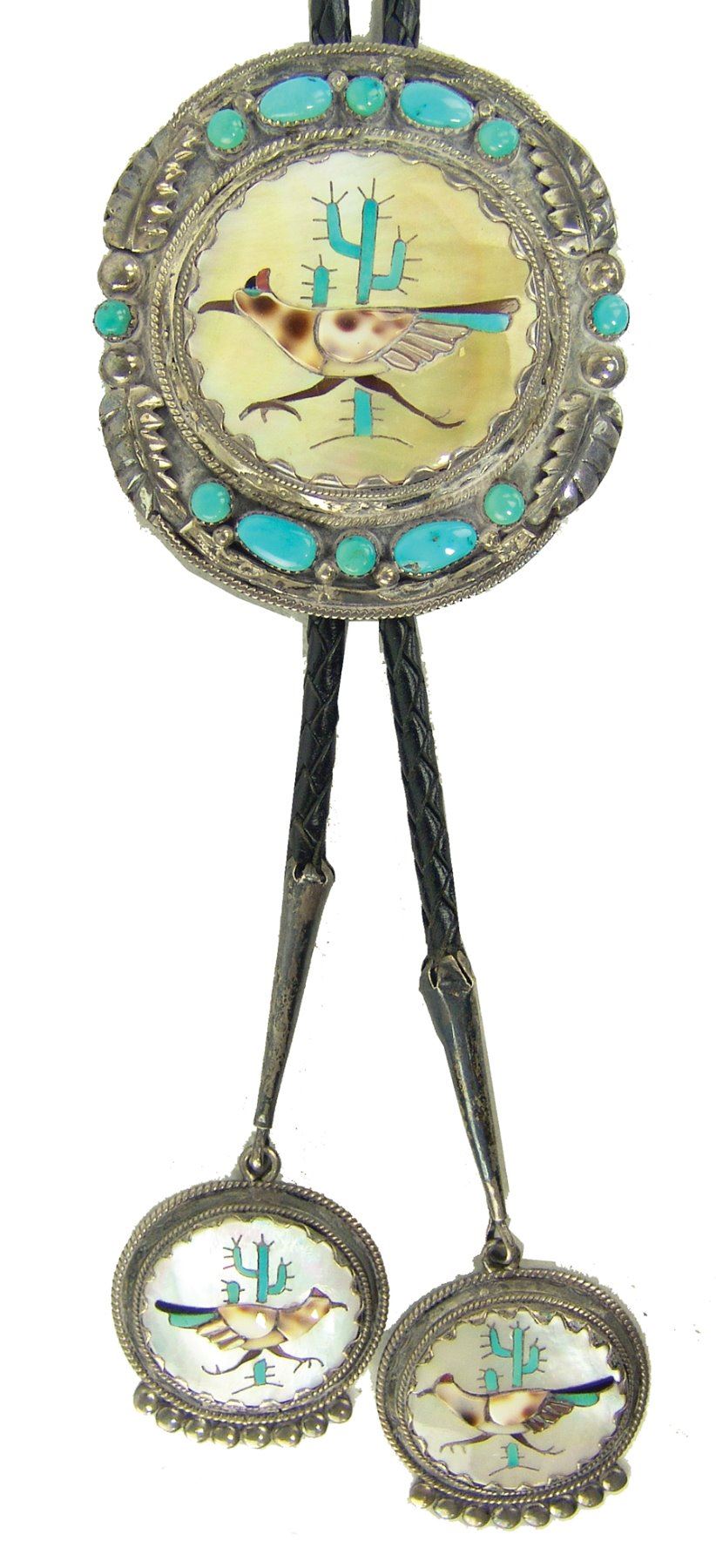 Very fine all silver bolo with custom matching tips featuring a scrambling road runner with Saguaro cactus in the background, all done with shell. Very good condition.,,3" x 2-3/4"