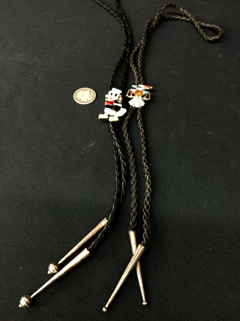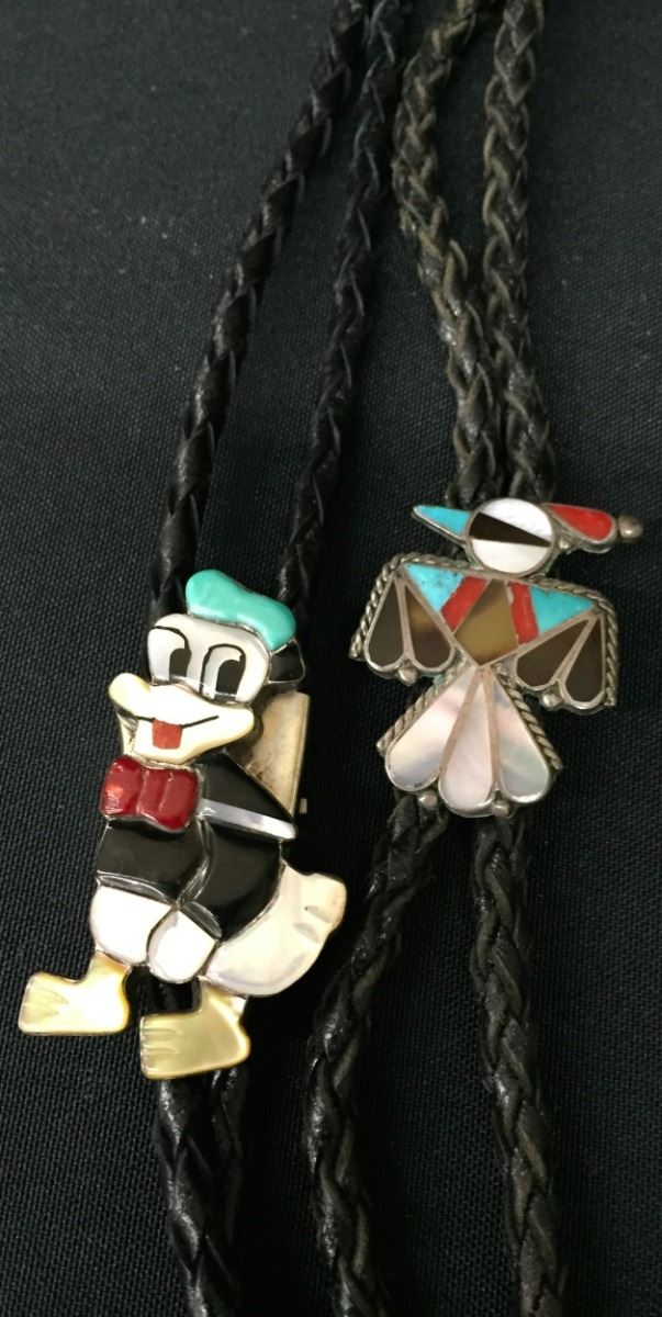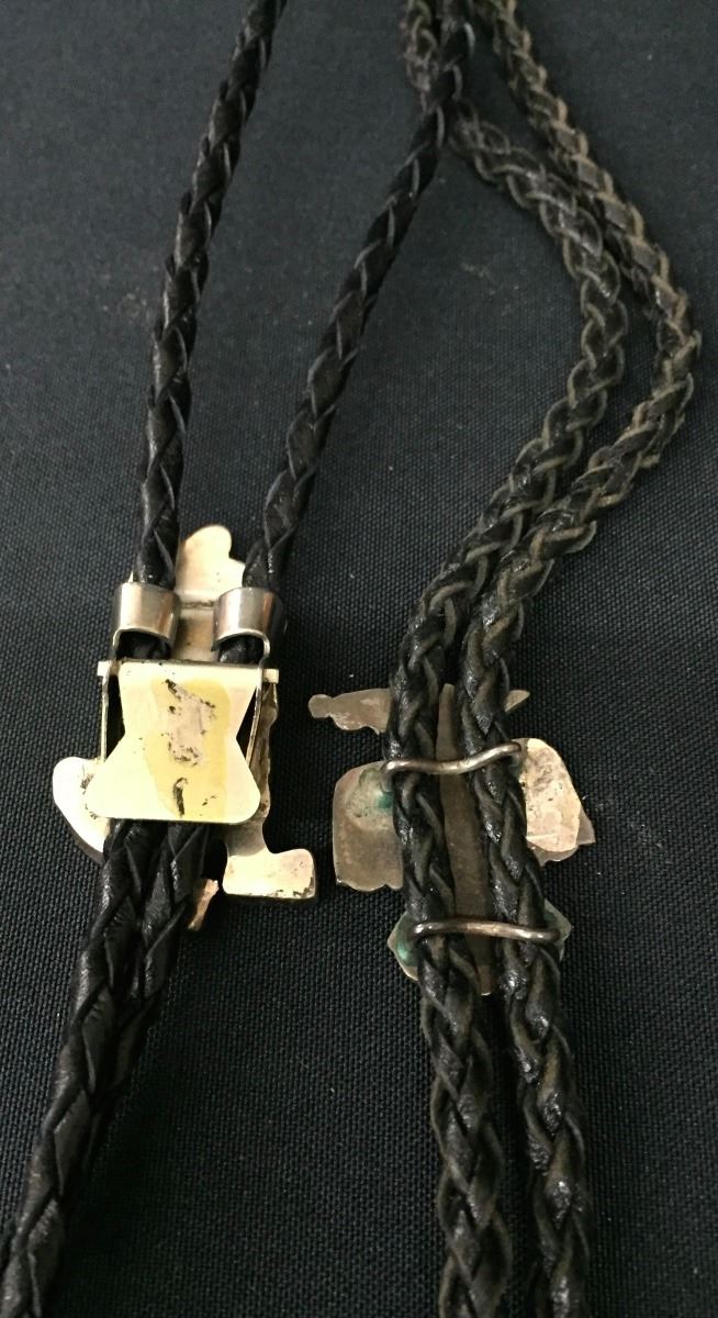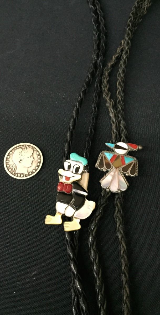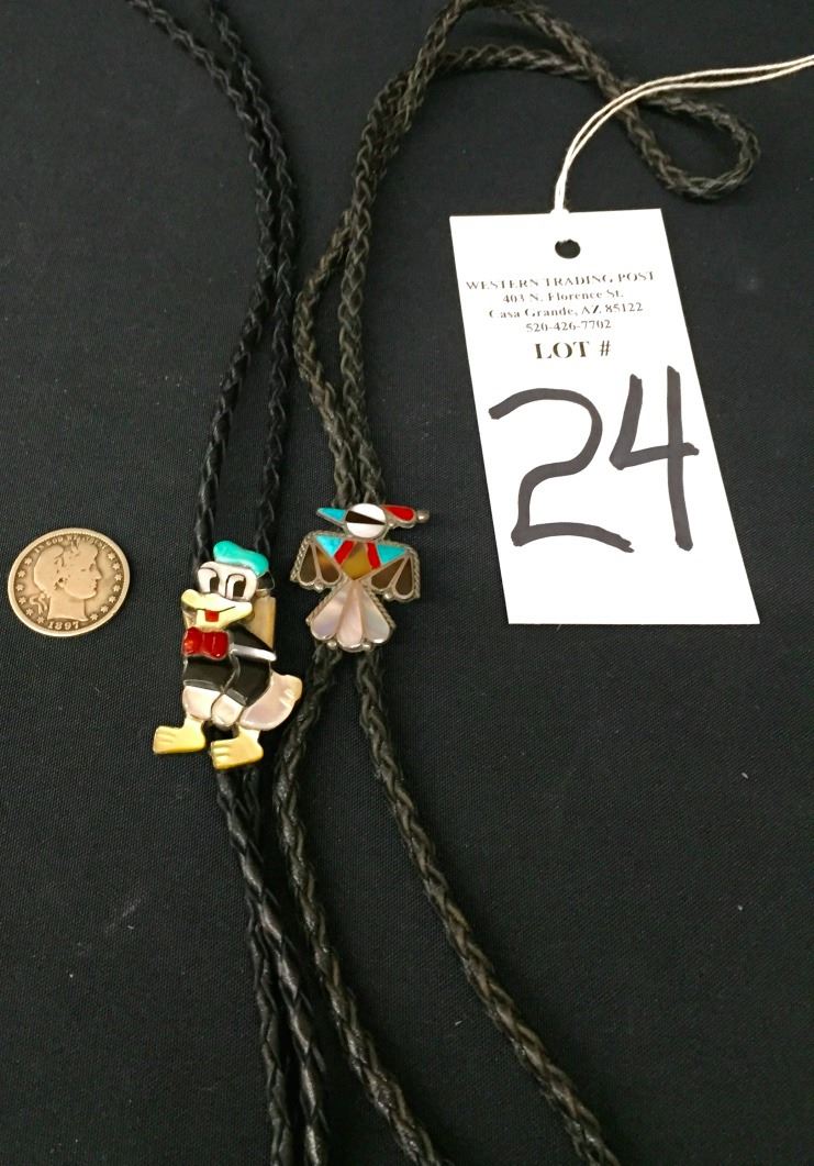 Both of these vintage bolos are Zuni inlay style, however neither one is signed. They are each set in sterling and are on 36" cords with sterling silver tips. Good condition. Please look closely at the pics as they are an important part of our description. Shipping: There will be a $5 handling / packaging fee for shipping this lot. The actual cost of postage will be added on top of that.