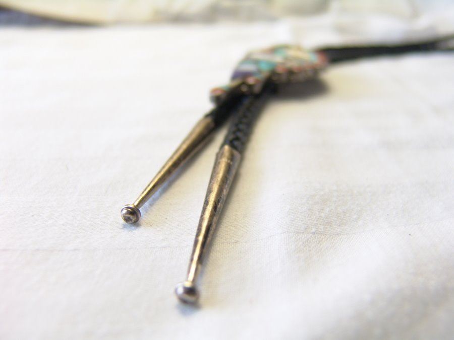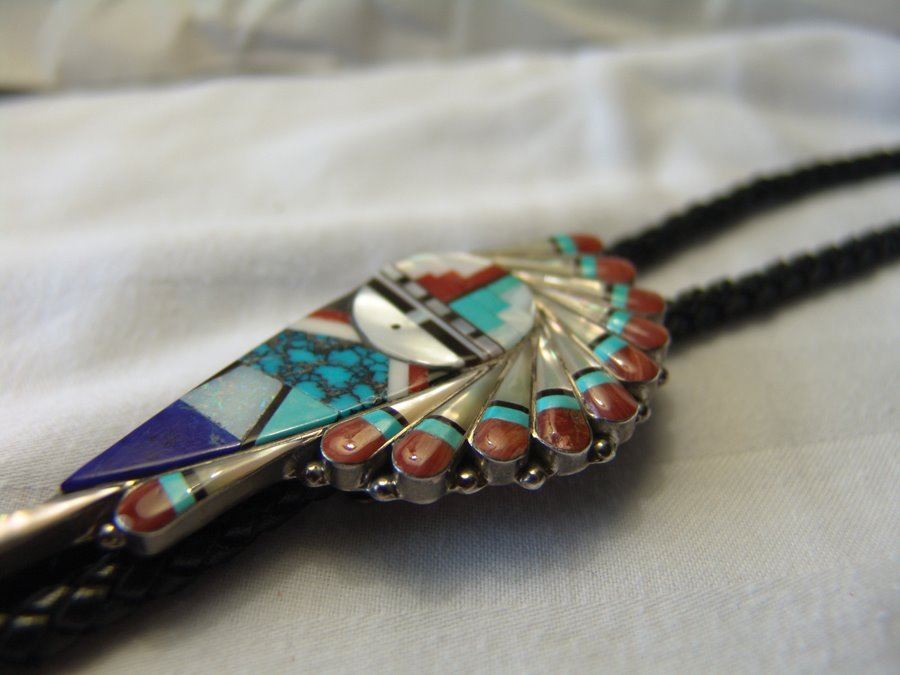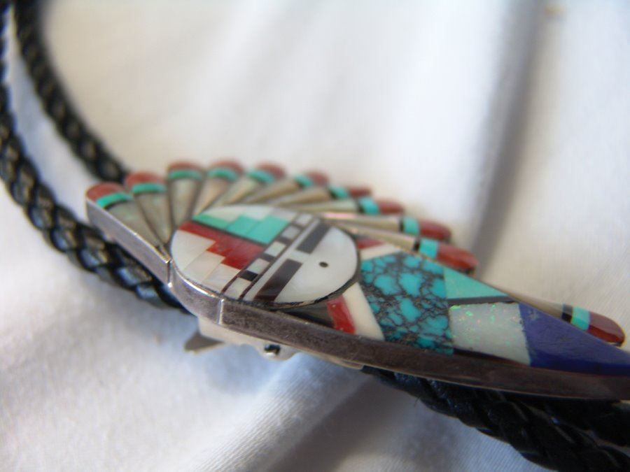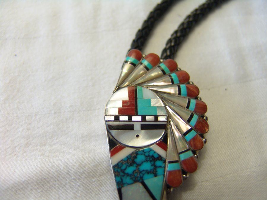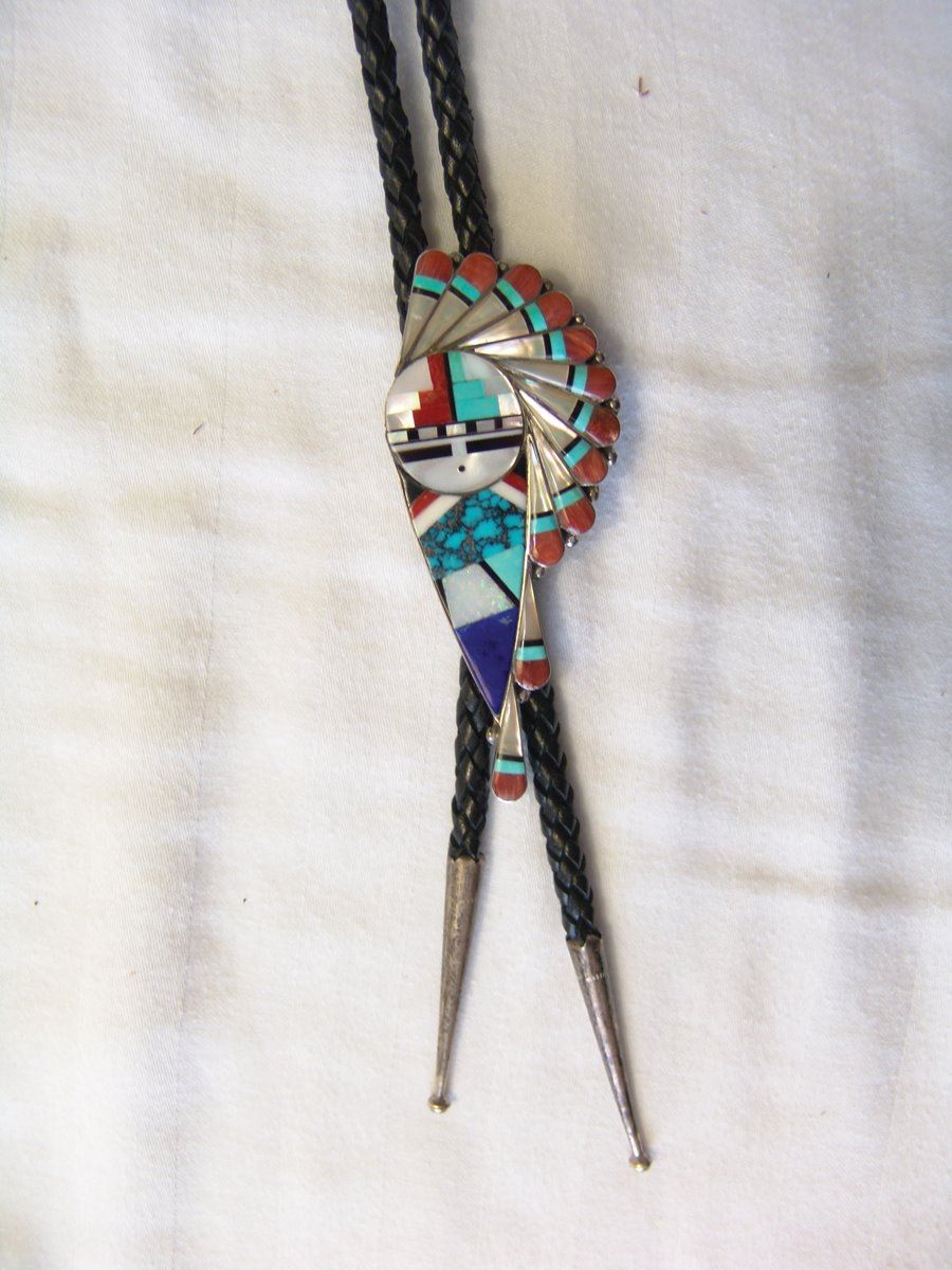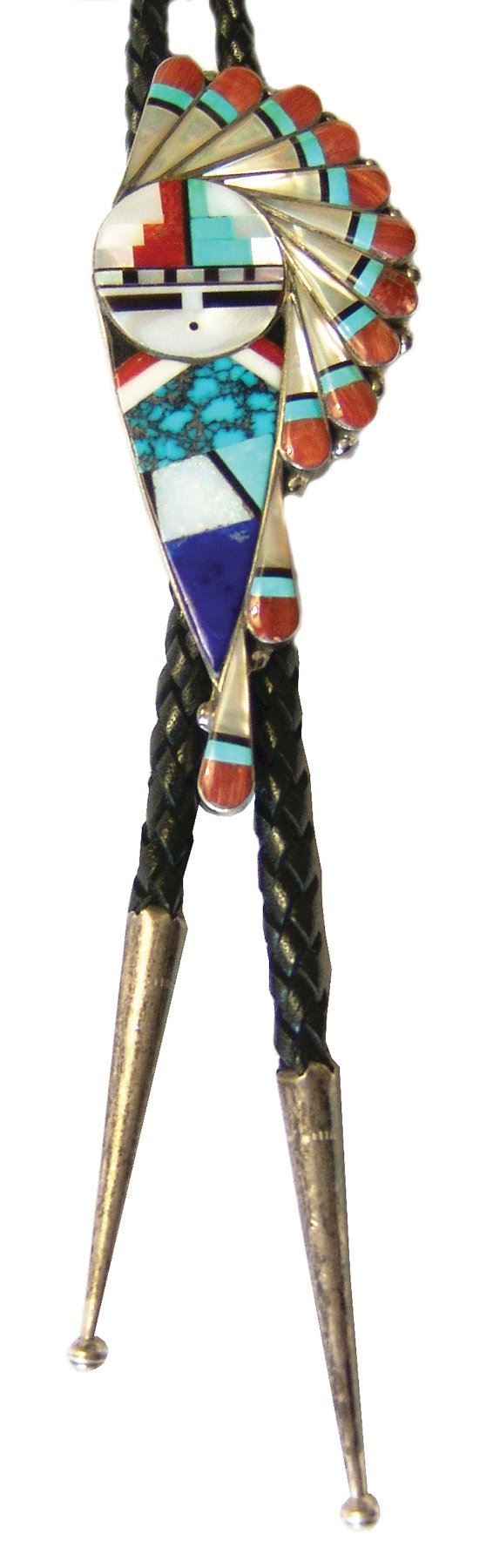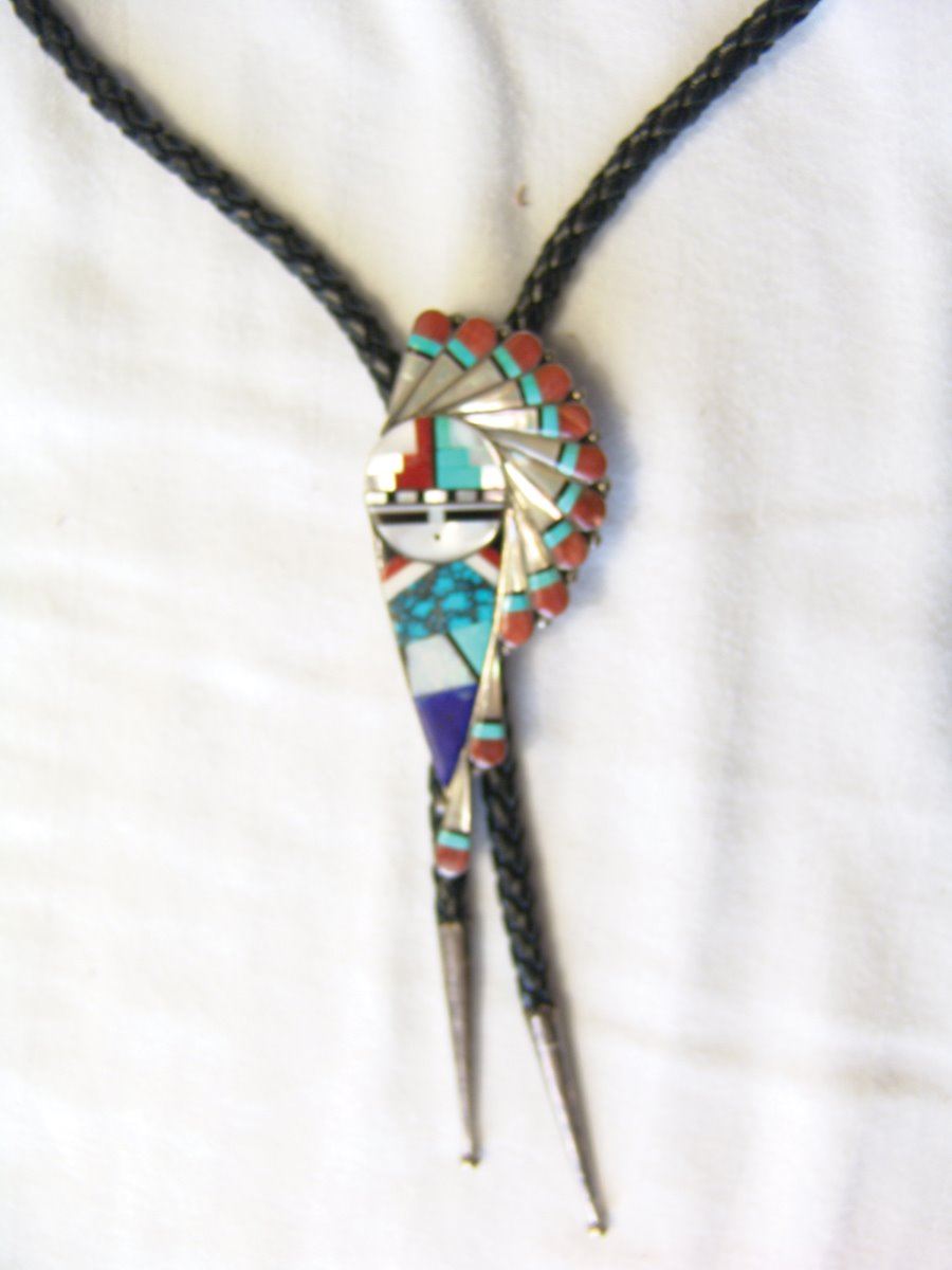Very fine original design all silver bolo tie with both mosaic and channel inlays, the design depicting a chief in a war bonnet. Very good condition.,,4-1/2" x 1-1/2"