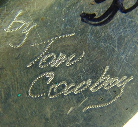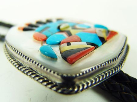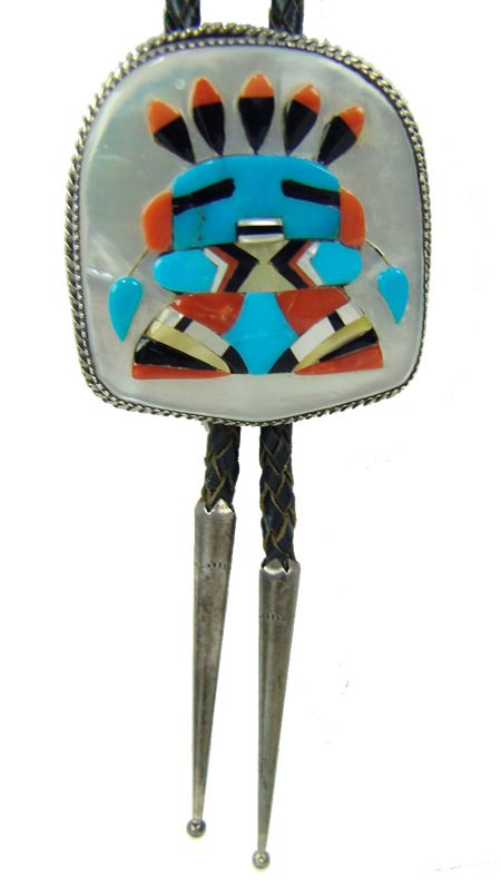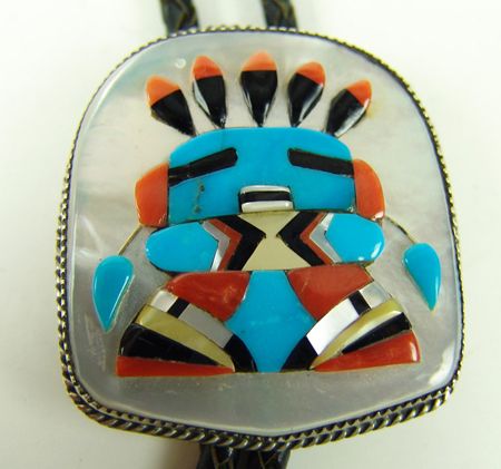 1976, Beautiful, raised mosaic inlay katsina head figure on a mother of pearl base and with a silver back. Very good condition. This is Zuni style, but Cowboy is Navajo. 39", 2-1/4" x 2"