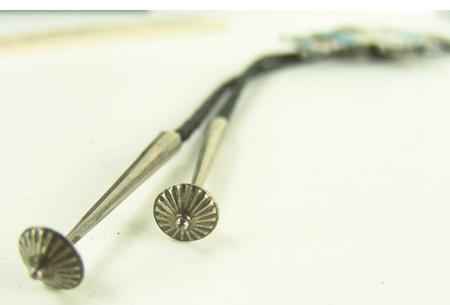 Circa 1980s, Very fine traditional channel inlay Chief Dancer bolo tie set on silver back. Very good condition, with etched details and with silver tips. 5" x 3"