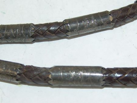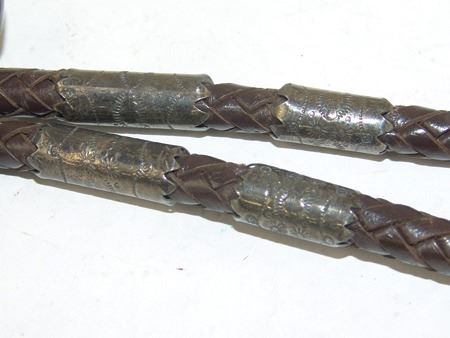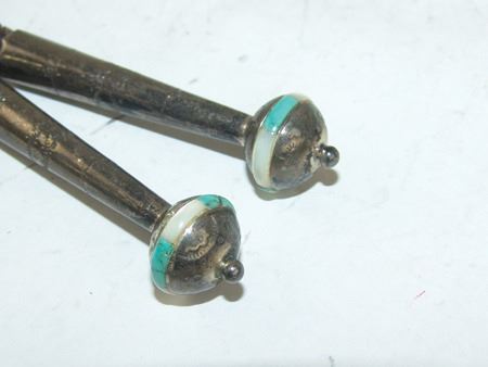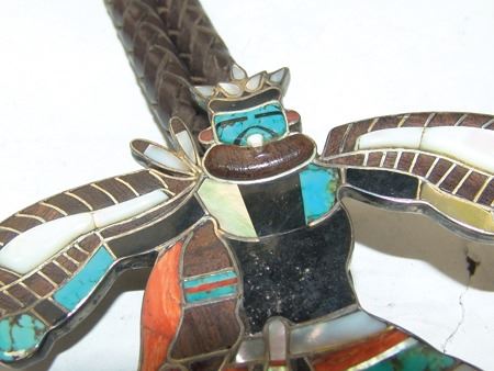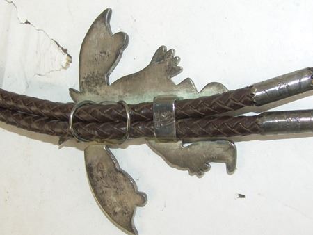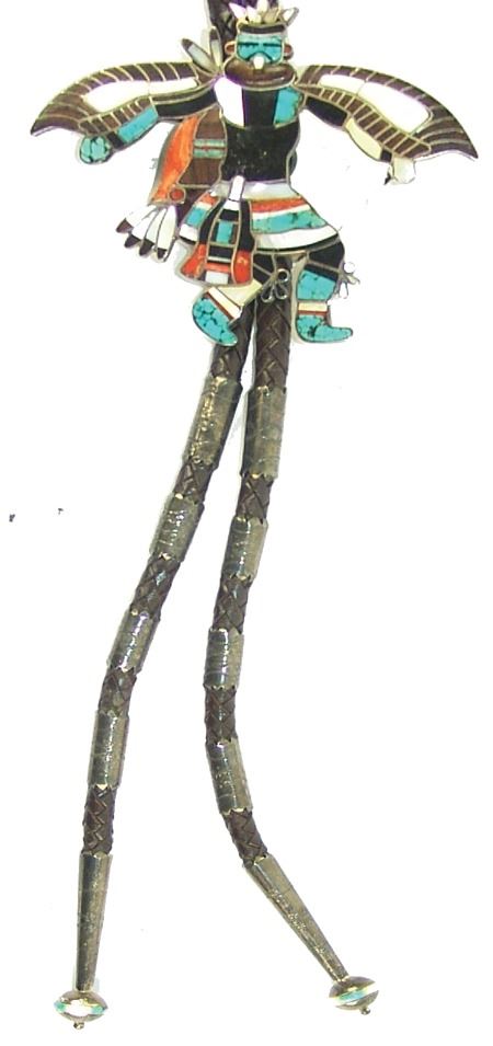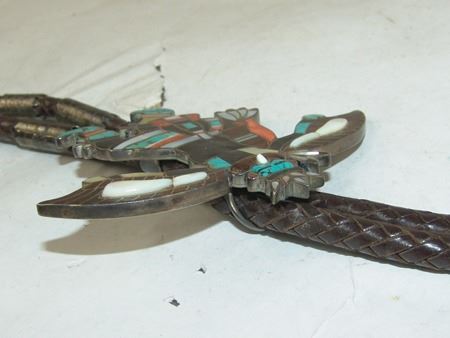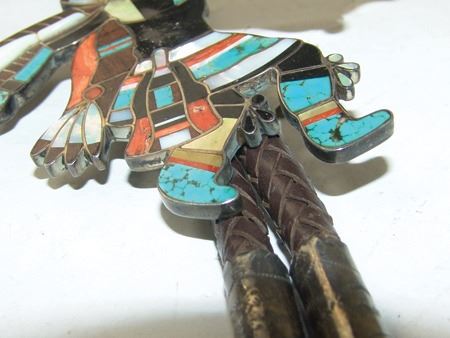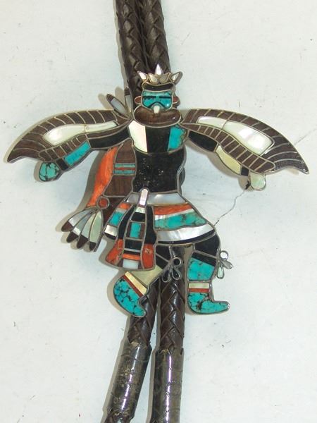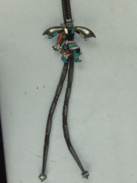 Ca. 1960s-1970s, Great vintage channel inlay silver bolo tie depicting an outstretched Eagle Dancer with barrel beads on the lower cord plus custom inlay tips. Very good condition. 42" long, 3" x 3-1/4"