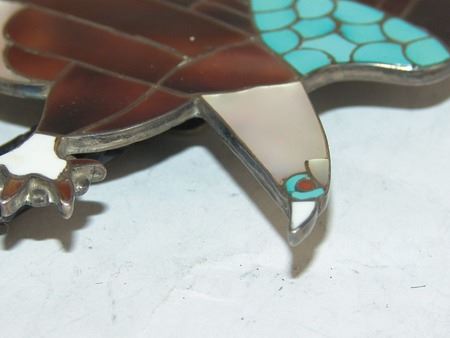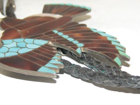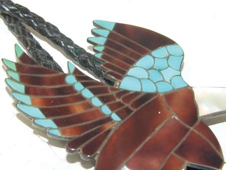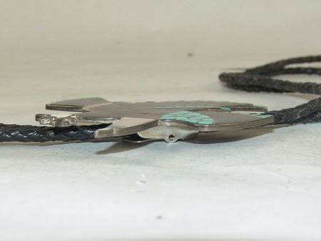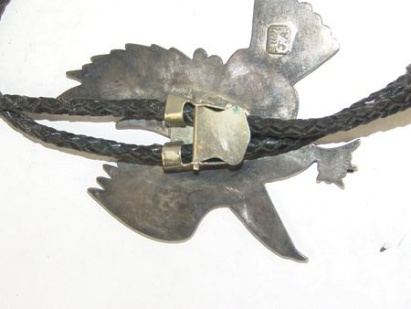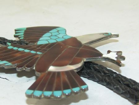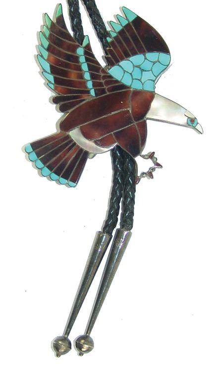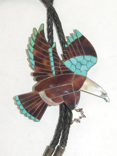 Ca. 1970s, Very fine all-silver channel inlay bolo tie depicting an alighting eagle. Very good condition. 38" long, 3-1/2" x 3"