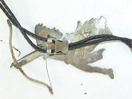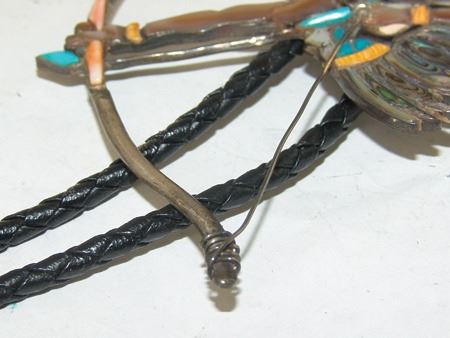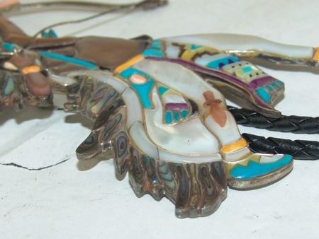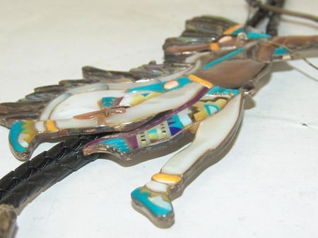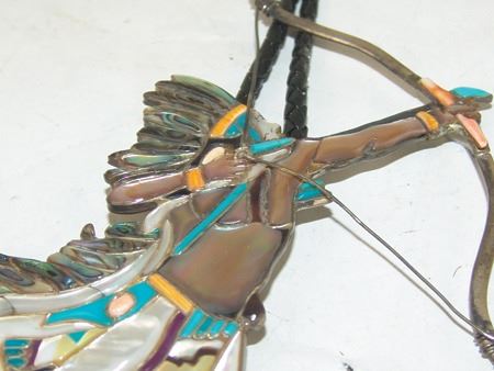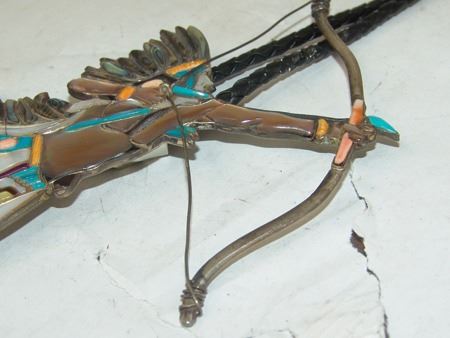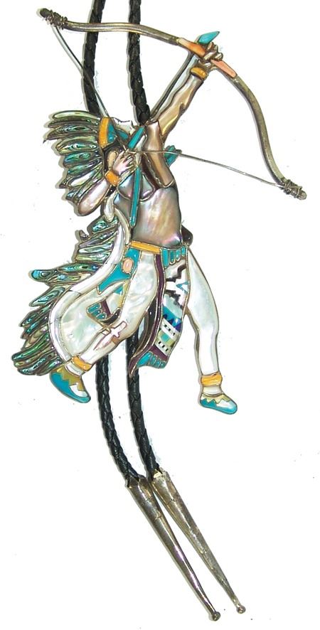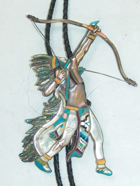 Ca. 1970s-1980s, Very fine silver channel inlay and mosaic bolo in the form of a poised figure wearing a headdress and pulling a bow and arrow. Very good condition. 36" long, 5" x 4"
