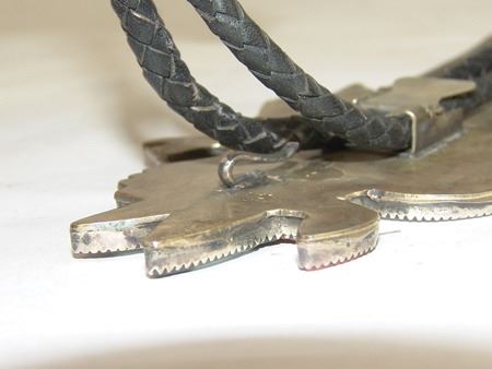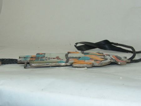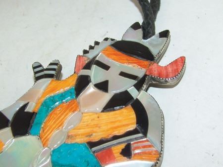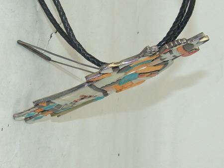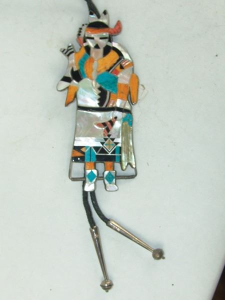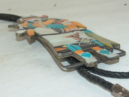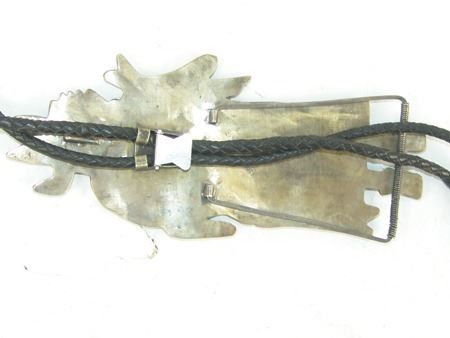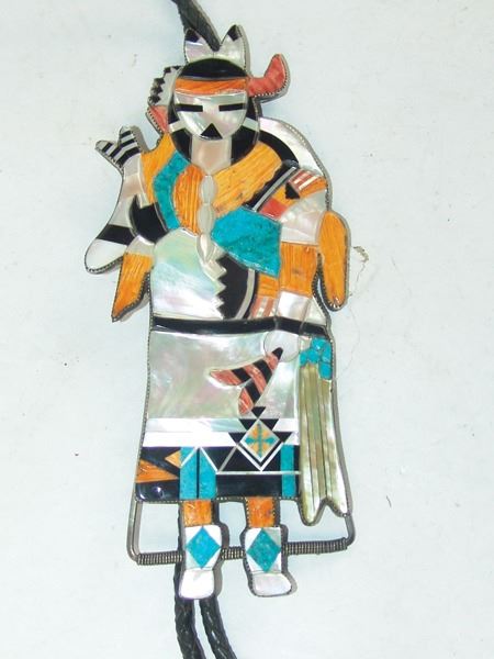 Ca. 1980s, Huge and amazing brass-backed silver bolo tie done in stone-to-stone inlay and depicting the "Rain Priest of the North." Very good condition, with custom tips. 49" long, bolo 8" x 3-1/2"
