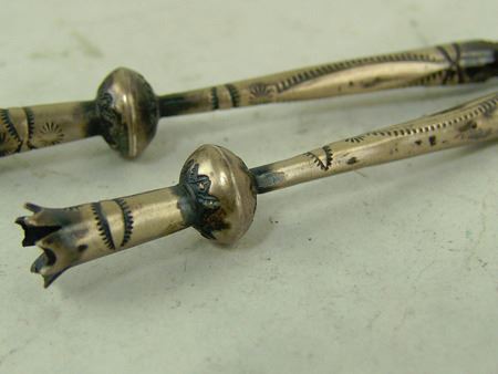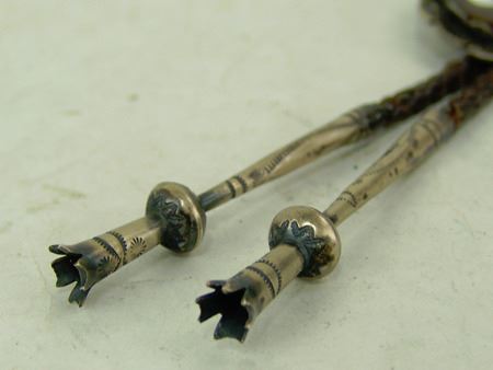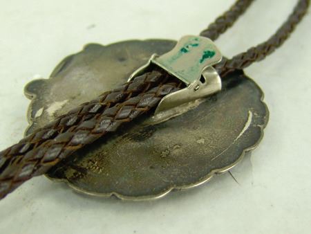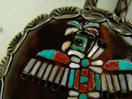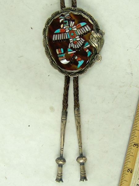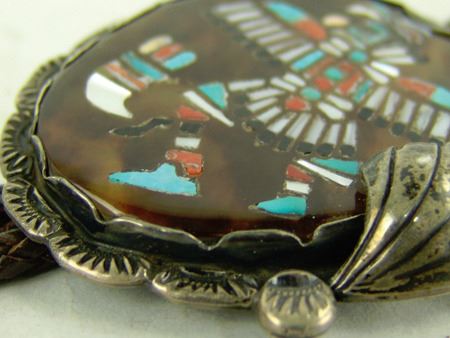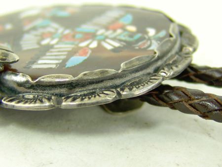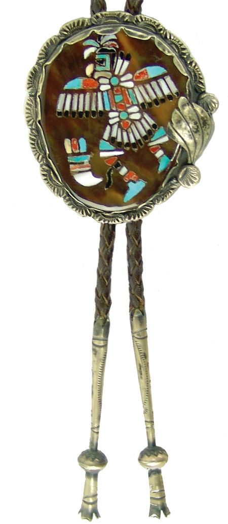 Ca. 1960s, Vintage all-silver bolo with very fine mosaic inlay eagle dancer on a brown shell disc and with leaf accents and squash blossom tips. Very good condition. Unsigned. 2-3/4" x 2-1/2"