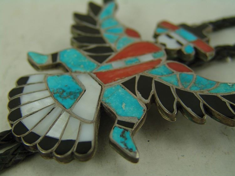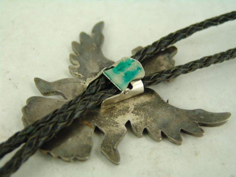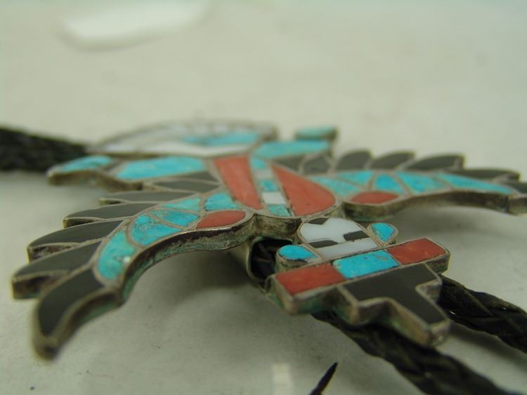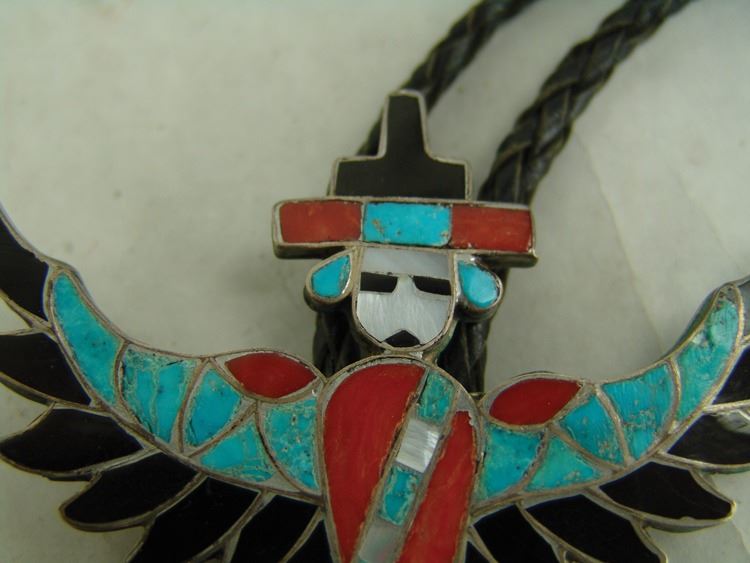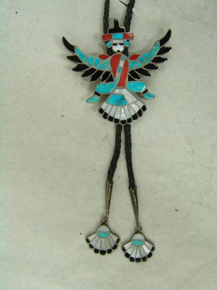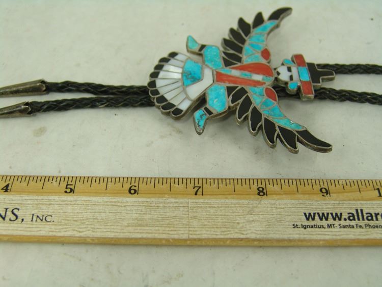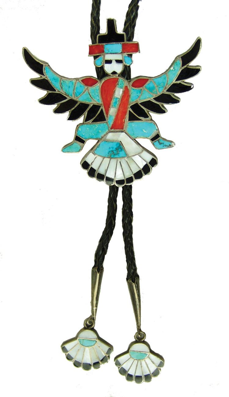 Traditional all-silver bolo with classic channel inlay featuring an eagle dancer and with custom matching tips. Very good condition. Unsigned.,Ca. 1970s,3-1/2" x 3-1/2"