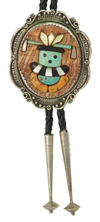 Vintage silver bolo with inlaid figure set in spondulus. 23" long, bolo 2-1/2' x 2"