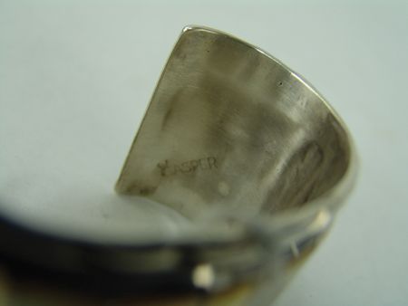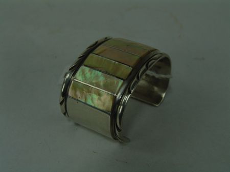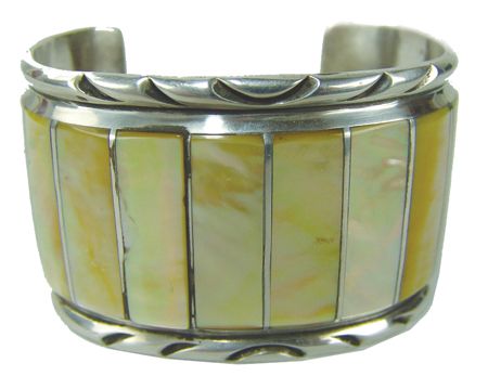 Ca. 1970s, Beautiful all-silver wide cuff bracelet inlaid with matching yellow shells. Very good condition. 5-1/4" + 1-3/8" x 1-1/8"
